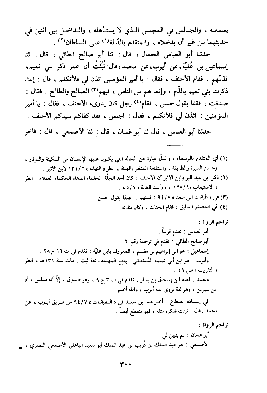 حَدَّثَنَا أَبُو الْعَبَّاسِ , قَالَ: ثنا أَبُو غَسَّانَ , قَالَ: ثنا الْأَصْمَعِيُّ , قَالَ: فَاخَرَ -[301]- رَجُلٌ مِنْ بَنِي تَمِيمٍ رَجُلًا مِنْ قُرَيْشٍ فَقَالَ: §«فِينَا أَحْلَمُ الْعَرَبِ الْأَحْنَفُ بْنُ قَيْسٍ»