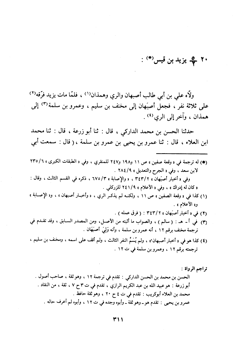§20 - يَزِيدُ بْنُ قَيْسٍ وَلَّاهُ عَلِيُّ بْنُ أَبِي طَالِبٍ أَصْبَهَانَ , وَالرِّيَّ , وَهَمَذَانَ , فَلَمَّا مَاتَ يَزِيدُ فَرَّقَهُ عَلَى ثَلَاثَةِ نَفَرٍ فَجَعَلَ أَصْبَهَانَ إِلَى مِخْنَفِ بْنِ سُلَيْمٍ , وَعَمْرَو بْنَ سَلَمَةَ إِلَى هَمَذَانَ وَآخَرَ إِلَى الرِّيِّ