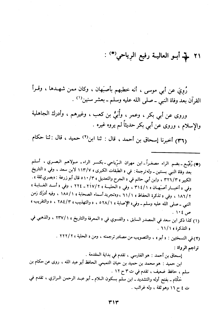 §21 - أَبُو الْعَالِيَةِ رُفَيْعٌ الرِّيَاحِيُّ رُوِيَ عَنْ أَبِي مُوسَى أَنَّهُ خَطَبَهُمْ بِأَصْبَهَانَ , وَكَانَ مِمَّنْ شَهِدَهَا وَقَرَأَ الْقُرْآنَ بَعْدَ وَفَاةِ النَّبِيِّ صَلَّى اللهُ عَلَيْهِ وَسَلَّمَ بِعَشْرِ سِنِينَ. وَرَوَى عَنْ أَبِي بَكْرٍ , وَعُمَرَ , وَأُبَيِّ بْنِ كَعْبٍ وَغَيْرِهِمْ , وَأَدْرَكَ الْجَاهِلِيَّةَ وَالْإِسْلَامَ , وَرَوَى عَنْ أَبِي بَكْرٍ حَدِيثًا لَمْ يَرْوِهِ غَيْرُهُ