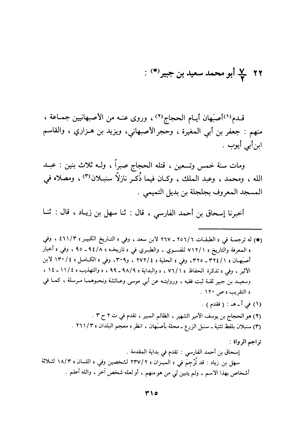 §22 - أَبُو مُحَمَّدٍ سَعِيدُ بْنُ جُبَيْرٍ قَدِمَ أَصْبَهَانَ أَيَّامَ الْحَجَّاجِ وَرَوَى عَنْهُ مِنَ الْأَصْبَهَانِيِّينَ جَمَاعَةٌ , مِنْهُمْ: جَعْفَرُ بْنُ أَبِي الْمُغِيرَةِ , وَحَجَرٌ الْأَصْبَهَانِيُّ , وَيَزِيدُ بْنُ هزاري , وَالْقَاسِمُ بْنُ أَبِي أَيُّوبَ , وَمَاتَ سَنَةَ خَمْسٍ وَتِسْعِينَ , قَتَلَهُ الْحَجَّاجُ صَبْرًا , وَلَهُ ثَلَاثُ بَنِينَ عَبْدُ اللَّهِ , وَمُحَمَّدٌ , وَعَبْدُ الْمَلِكِ , وَكَانَ فِيمَا ذُكِرَ نَازِلًا سُنْبُلَانَ , وَمُصَلَّاهُ فِي الْمَسْجِدِ الْمَعْرُوفِ بِجَلْجَلَةَ بْنِ بُدَيْلٍ التَّمِيمِيِّ