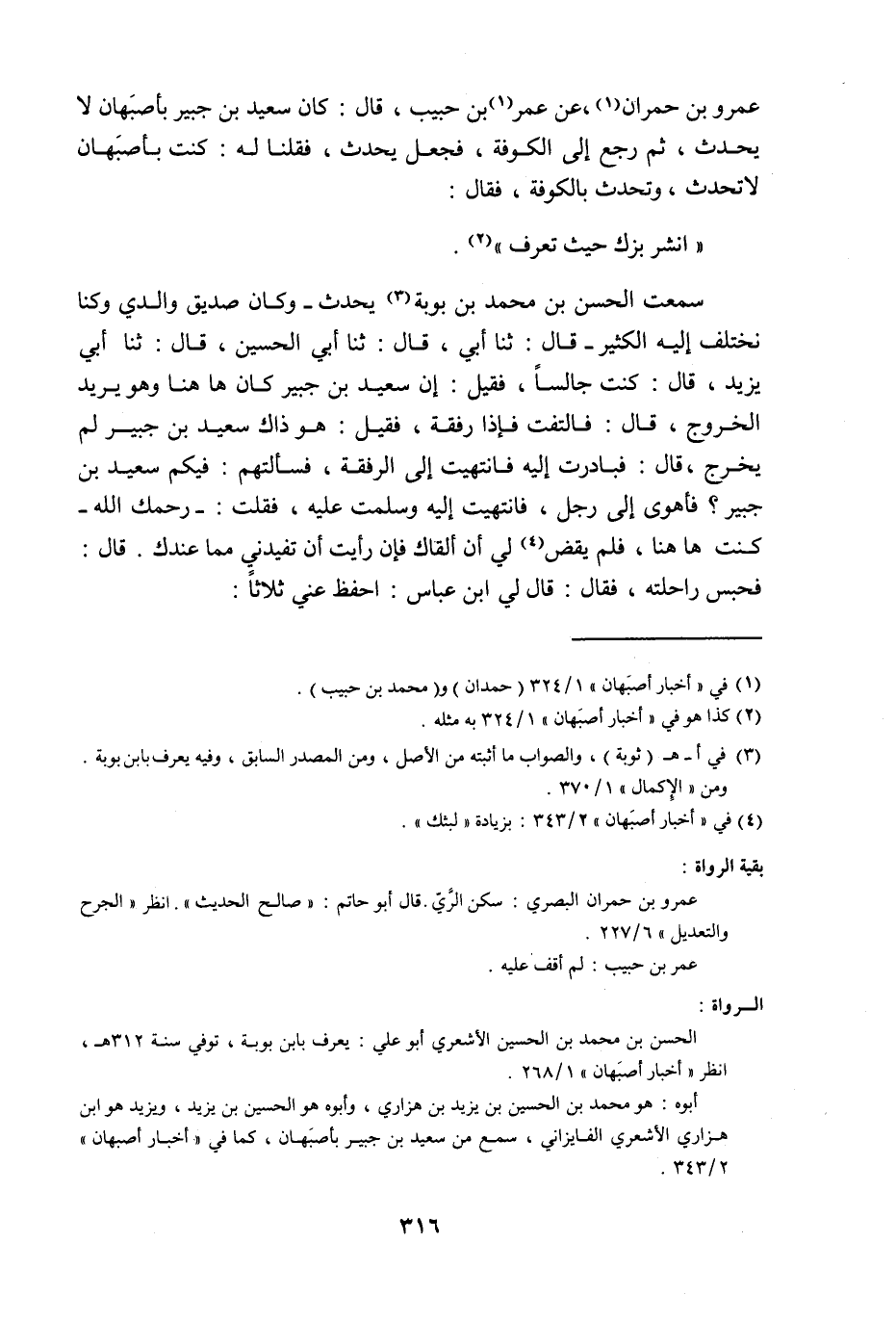 سَمِعْتُ الْحَسَنَ بْنَ مُحَمَّدِ بْنِ بَوْبَةَ يُحَدِّثُ وَكَانَ صَدِيقَ وَالِدِي وَكُنَّا نَخْتَلِفُ إِلَيْهِ الْكَثِيرَ , قَالَ: ثنا أَبِي قَالَ: ثنا أَبِي الْحُسَيْنِ قَالَ: ثنا أَبِي يَزِيدَ قَالَ: كُنْتُ جَالِسًا فَقِيلَ إِنَّ سَعِيدَ بْنَ جُبَيْرٍ كَانَ هَا هُنَا , وَهُوَ يُرِيدُ الْخُرُوجَ قَالَ: فَالْتَفَتَ فَإِذَا رُفْقَةٌ فَقِيلَ هُوَ ذَاكَ سَعِيدُ بْنُ جُبَيْرٍ لَمْ يَخْرُجْ: قَالَ: فَبَادَرْتُ إِلَيْهِ فَانْتَهَيْتُ إِلَى الرُّفْقَةِ فَسَأَلْتُهُمْ: فِيكُمْ سَعِيدِ بْنِ جُبَيْرٍ؟ فَأَهْوَى إِلَى رَجُلٍ فَانْتَهَيْتُ إِلَيْهِ: وَسَلَّمْتُ عَلَيْهِ فَقُلْتُ: رَحِمَكَ اللَّهُ كُنْتُ هَاهُنَا فَلَمْ يُقْضَ لِي أَنْ أَلْقَاكَ فَإِنْ رَأَيْتَ أَنْ تُفِيدَنِي مِمَّا عِنْدَكَ قَالَ: فَحَبَسَ رَاحِلَتَهُ فَقَالَ: قَالَ لِيَ ابْنُ عَبَّاسٍ: §«احْفَظْ عَنِّي ثَلَاثًا -[317]- إِيَّاكَ وَالنَّظَرَ فِي النُّجُومِ فَإِنَّهُ يَدْعُو إِلَى الْكِهَانَةِ , وَإِيَّاكَ وَالنَّظَرُ فِي الْقَدَرِ فَإِنَّهُ يَدْعُو إِلَى الزَّنْدَقَةِ , وَإِيَّاكَ وَشَتْمَ أَصْحَابِ رَسُولِ اللَّهِ صَلَّى اللهُ عَلَيْهِ وَسَلَّمَ فَيُكِبَّكَ اللَّهُ عَلَى وَجْهِكَ يَوْمَ الْقِيَامَةِ» حَدَّثَنَا مُحَمَّدُ بْنُ الْحَسَنِ , قَالَ: ثنا عَمْرُو بْنُ عَلِيٍّ , قَالَ: قُتِلَ سَعِيدُ بْنُ جُبَيْرٍ فِي سَنَةِ أَرْبَعٍ وَتِسْعِينَ وَهُوَ ابْنُ خَمْسِينَ سَنَةً إِلَّا نِصْفَ سَنَةٍ وَيُكْنَى أَبَا عَبْدِ اللَّهِ وَهُوَ مَوْلًى لِبَنِي وَالِبَةَ حَيُّ مِنْ بَنِي أَسَدٍ