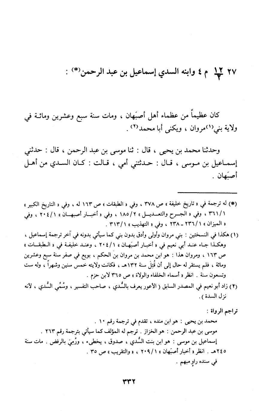§وَابْنُهُ السُّدِّيُّ إِسْمَاعِيلُ بْنُ عَبْدِ الرَّحْمَنِ كَانَ عَظِيمًا مِنْ عُظَمَاءِ أَهْلِ أَصْبَهَانَ , وَمَاتَ سَنَةَ سَبْعٍ وَعِشْرِينَ وَمِائَةٍ فِي وِلَايَةِ بَنِي مَرْوَانَ وَيُكْنَى أَبَا مُحَمَّدٍ وَحَدَّثَنَا مُحَمَّدُ بْنُ يَحْيَى , قَالَ: ثنا مُوسَى بْنُ عَبْدِ الرَّحْمَنِ , قَالَ: حَدَّثَنِي إِسْمَاعِيلُ بْنُ مُوسَى , قَالَ: حَدَّثَتْنِي أُمِّي , قَالَتْ: كَانَ السُّدِّيُّ مِنْ أَهْلِ أَصْبَهَانَ