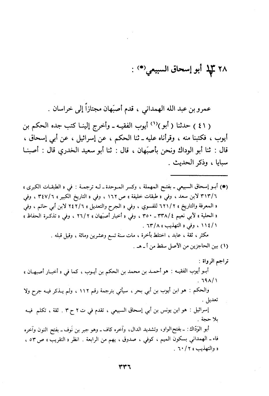 §28 - أَبُو إِسْحَاقَ السَّبِيعِيُّ عَمْرُو بْنُ عَبْدِ اللَّهِ الْهَمْدَانِيُّ قَدِمَ أَصْبَهَانَ مُجْتَازًا إِلَى خُرَاسَانَ حَدَّثَنَا أَبُو أَيُّوبَ الْفَقِيهُ , وَأَخْرَجَ إِلَيْنَا كُتُبَ جَدِّهِ الْحَكَمِ بْنِ أَيُّوبَ , فَكَتَبْنَا مِنْهُ وَقَرَأْنَاهُ عَلَيْهِ , ثنا الْحَكَمُ عَنْ إِسْرَائِيلَ عَنْ أَبِي إِسْحَاقَ قَالَ: ثنا أَبُو الْوَدَّاكِ وَنَحْنُ بِأَصْبَهَانَ قَالَ: ثنا أَبُو سَعِيدٍ الْخُدْرِيُّ قَالَ: أَصَبْنَا سَبَايَا , وَذَكَرَ الْحَدِيثَ ,