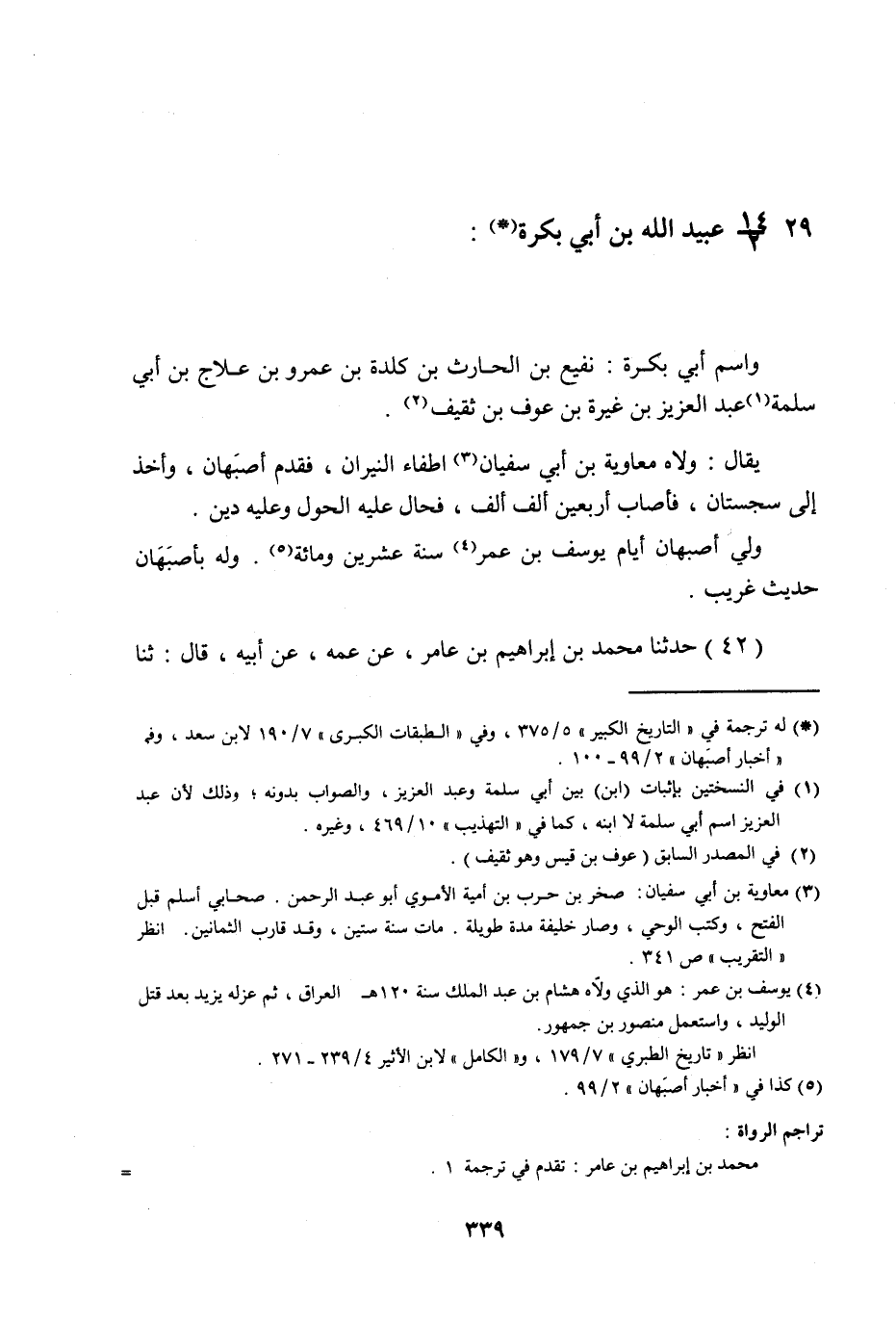 §29 - عُبَيْدُ اللَّهِ بْنُ أَبِي بَكْرَةَ وَاسْمُ أَبِي بَكْرَةَ: نُفَيْعُ بْنُ الْحَارِثِ بْنِ كَلْدَةَ بْنِ عَمْرِو بْنِ عَلَّاجِ بْنِ أَبِي سَلَمَةَ عَبْدِ الْعَزِيزِ بْنِ غَيْرَةَ بْنِ عَوْفِ بْنِ ثَقِيفٍ يُقَالُ وَلَّاهُ مُعَاوِيَةُ بْنُ أَبِي سُفْيَانَ إِطْفَاءَ النِّيرَانِ فَقَدِمَ أَصْبَهَانَ وَأَخَذَ إِلَى سِجِسْتَانَ فَأَصَابَ أَرْبَعِينَ أَلْفَ أَلْفٍ , فَحَالَ عَلَيْهِ الْحَوْلُ وَعَلَيْهِ دَيْنٌ , وَلِيَ أَصْبَهَانَ أَيَّامَ يُوسُفَ بْنِ عُمَرَ سَنَةَ عِشْرِينَ وَمِائَةٍ وَلَهُ بِأَصْبَهَانَ حَدِيثٌ غَرِيبٌ