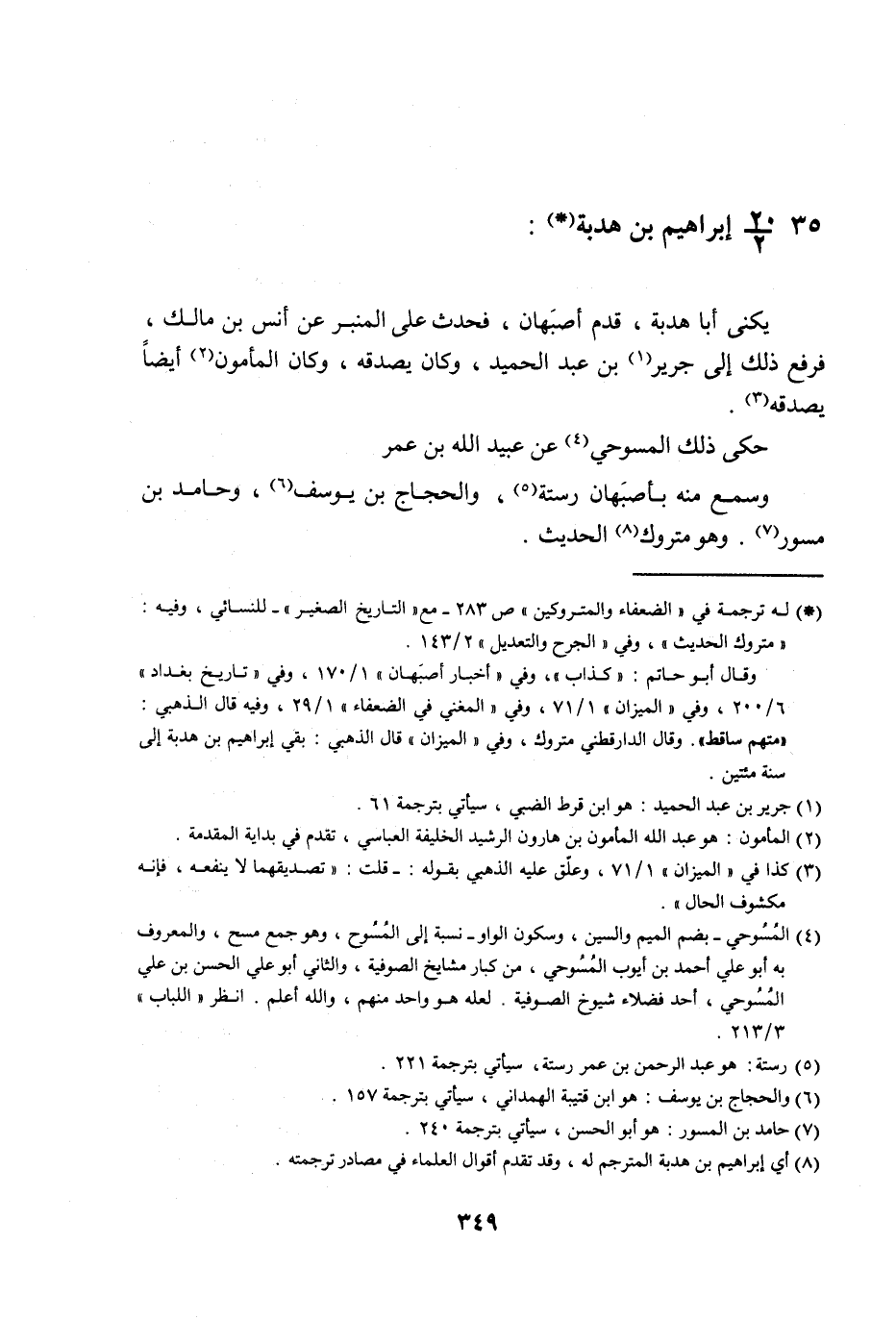 §35 - إِبْرَاهِيمُ بْنُ هُدْبَةَ يُكَنَّى أَبَا هُدْبَةَ قَدِمَ أَصْبَهَانَ فَحَدَّثَ عَلَى الْمِنْبَرِ عَنْ أَنَسِ بْنِ مَالِكٍ , فَرُفِعَ ذَلِكَ إِلَى جَرِيرِ بْنِ عَبْدِ الْحَمِيدِ , وَكَانَ يُصَدِّقُهُ وَكَانَ الْمَأْمُونُ أَيْضًا يُصَدِّقُهُ , حَكَى ذَلِكَ الْمُسُوحِيُّ عَنْ عُبَيْدِ اللَّهِ بْنِ عُمَرَ , وَسَمِعَ مِنْهُ بِأَصْبَهَانَ رُسْتَهْ , وَالْحَجَّاجُ بْنُ يُوسُفَ , وَحَامِدُ بْنُ مِسْوَرٍ , وَهُوَ مَتْرُوكُ الْحَدِيثِ