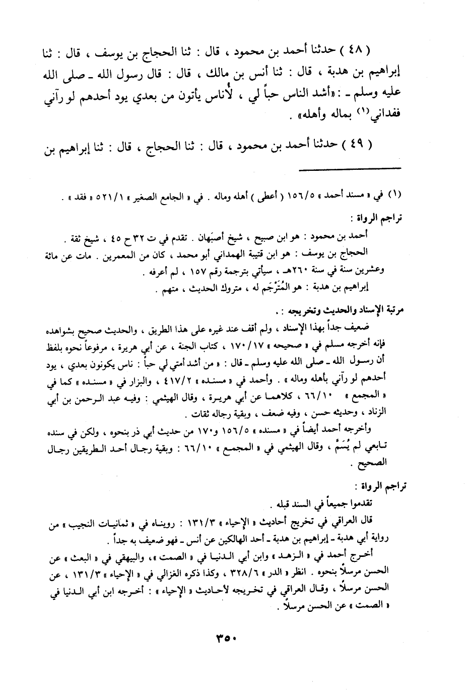 حَدَّثَنَا أَحْمَدُ بْنُ مَحْمُودٍ , قَالَ: ثنا الْحَجَّاجُ بْنُ يُوسُفَ , قَالَ: ثنا إِبْرَاهِيمُ بْنُ هُدْبَةَ , قَالَ: ثنا أَنَسُ بْنُ مَالِكٍ , قَالَ: قَالَ رَسُولُ اللَّهِ صَلَّى اللهُ عَلَيْهِ وَسَلَّمَ: §«أَشَدُّ النَّاسِ حُبًّا لِي لَأُنَاسٌ يَأْتُونَ مِنْ بَعْدِي يَوَدُّ أَحَدُهُمْ لَوْ رَآنِي فَفَدَانِي بِمَالِهِ وَأَهْلِهِ»