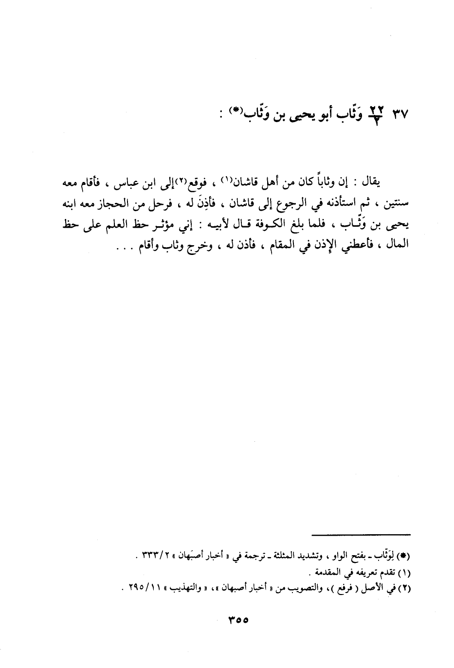 §37 - وَثَّابٌ أَبُو يَحْيَى بْنُ وَثَّابٍ يُقَالُ: إِنَّ وَثَّابًا كَانَ مِنْ أَهْلِ قَاشَانَ فَوَقَعَ إِلَى ابْنِ عَبَّاسٍ فَأَقَامَ مَعَهُ سَنَتَيْنِ ثُمَّ اسْتَأْذَنَهُ فِي الرُّجُوعِ إِلَى قَاشَانَ فَأَذِنَ لَهُ فَرَحَلَ مِنَ الْحِجَازِ مَعَهُ ابْنُهُ يَحْيَى بْنُ وَثَّابٍ , فَلَمَّا بَلَغَ الْكُوفَةَ قَالَ لِأَبِيهِ: إِنِّي مُؤْثِرٌ حَظَّ الْعِلْمِ عَلَى حَظِّ الْمَالِ , فَأَعْطِنِي الْإِذْنَ فِي الْمُقَامِ , فَأَذِنَ لَهُ وَخَرَجَ وَثَّابٌ وَأَقَامَ