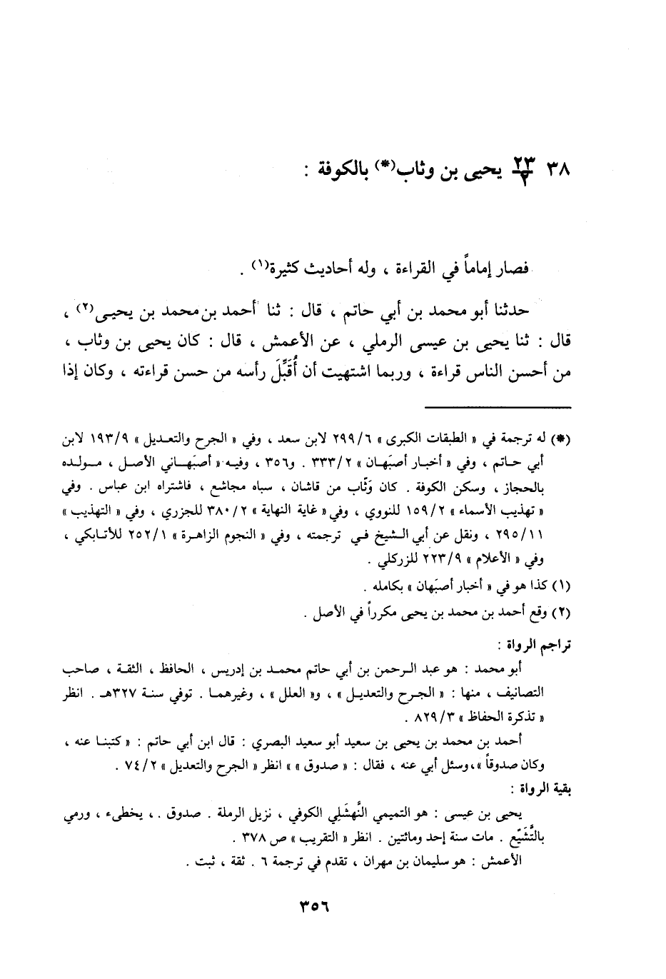 §38 - يَحْيَى بْنُ وَثَّابٍ بِالْكُوفَةِ فَصَارَ إِمَامًا فِي الْقِرَاءَةِ وَلَهُ أَحَادِيثُ كَثِيرَةٌ