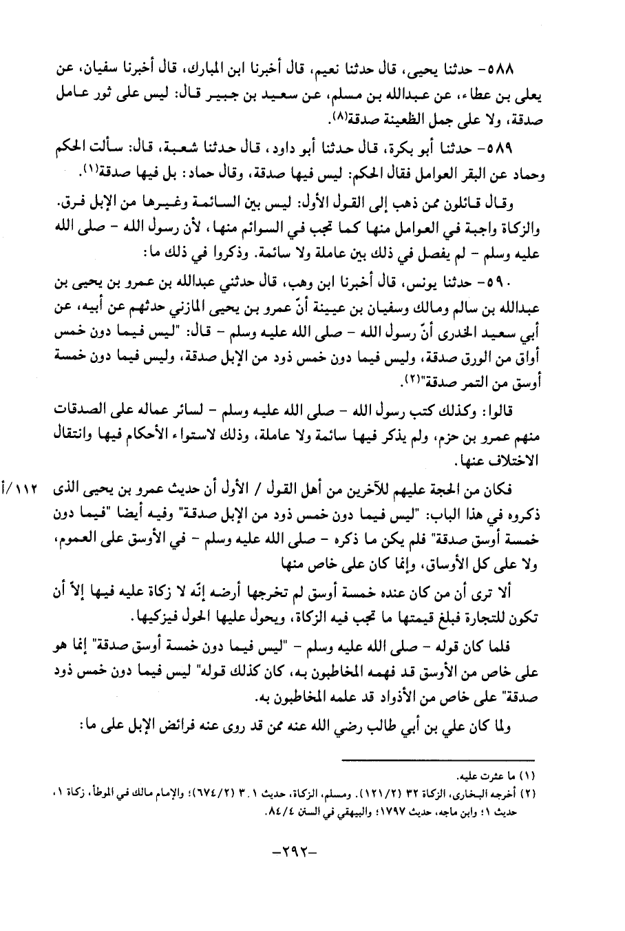 590 -حَدَّثَنَا يُونُسُ، قَالَ: أَخْبَرَنَا ابْنُ وَهْبٍ، قَالَ: حَدَّثَنِي عَبْدُ اللهِ بْنُ عُمَرِ ويَحْيَى بْنِ عَبْدِ اللهِ بْنِ سَالِمٍ، وَمَالِكٌ، وَسُفْيَانُ بْنُ عُيَيْنَةَ، أَنَّ عَمْرَو بْنَ يَحْيَى الْمَازِنِيَّ حَدَّثَهُمْ، عَنْ أَبِيهِ، عَنْ أَبِي سَعِيدٍ الْخُدْرِيِّ، أَنَّ رَسُولَ اللهِ صَلَّى اللَّهُ عَلَيْهِ وَسَلَّمَ، قَالَ: " لَيْسَ فِيمَا دُونَ خَمْسِ أَوَاقٍ مِنَ الْوَرِقِ صَدَقَةٌ، وَلَيْسَ فِيمَا دُونَ خَمْسِ ذَوْدٍ مِنَ الإِبِلِ صَدَقَةٌ، وَلَيْسَ فِيمَا دُونَ خَمْسَةِ أَوْسُقٍ مِنَ التَّمْرِ صَدَقَةٌ " قَالُوا: وَكَذَلِكَ كَتَبَ رَسُولُ اللهِ صَلَّى اللَّهُ عَلَيْهِ وَسَلَّمَ لِسَائِرِ عُمَّالِهِ عَلَى الصَّدَقَاتِ مِنْهُمْ: عَمْرُو بْنُ حَزْمٍ، وَلَمْ يَذْكُرْ فِيهَا سَائِمَةً وَلا عَامِلَةً، وَذَلِكَ لاسْتِوَاءِ الأَحْكَامِ فِيهَا وَانْتِقَالَ الاخْتِلافِ عَنْهَا فَكَانَ مِنَ الْحُجَّةِ عَلَيْهِمْ لِلآخَرِينَ مِنْ أَهْلِ الْقَوْلِ الأَوَّلِ أَنَّ حَدِيثَ عَمْرِو بْنِ يَحْيَى الَّذِي ذَكَرُوهُ فِي هَذَا الْبَابِ: " لَيْسَ فِيمَا دُونَ خَمْسِ ذَوْدٍ مِنَ الإِبِلِ صَدَقَةٌ "، وَفِيهِ أَيْضًا: " فِيمَا دُونَ خَمْسَةِ أَوْسُقٍ صَدَقَةٌ، فَلَمْ يَكُنْ مَا ذَكَرَهُ صَلَّى اللَّهُ عَلَيْهِ وَسَلَّمَ فِي الأَوْسُقِ عَلَى الْعُمُومِ، وَلا عَلَى كُلِّ الأَوْسَاقِ، وَإِنَّمَا كَانَ عَلَى خَاصٍّ مِنْهَا أَلا تَرَى أَنَّ مَنْ كَانَ عِنْدَهُ خَمْسَةُ أَوْسُقٍ لَمْ تُخْرِجْهَا أَرْضُهُ أَنَّهُ لَا زَكَاةَ عَلَيْهِ فِيهَا إِلا أَنْ تَكُونَ لِلتِّجَارَةِ، فَبَلَغَ قِيمَتُهَا مَا تَجِبُ فِيهِ الزَّكَاةُ، وَيَحُولُ عَلَيْهَا الْحَوْلُ فَيُزَكِّيهَا فَلَمَّا كَانَ قَوْلُهُ صَلَّى اللَّهُ عَلَيْهِ وَسَلَّمَ: " لَيْسَ فِيمَا دُونَ خَمْسَةِ أَوْسُقٍ صَدَقَةٌ "، إِنَّمَا هُوَ عَلَى خَاصٍّ مِنَ الأَوْسُقِ قَدْ فَهِمَهُ الْمُخَاطَبُونَ بِهِ، كَانَ كَذَلِكَ قَوْلُهُ: " لَيْسَ فِيمَا دُونَ خَمْسِ ذَوْدٍ صَدَقَةٌ " عَلَى خَاصٍّ مِنَ الأَذْوَادِ قَدْ عَلِمَهُ الْمُخَاطَبُونَ بِهِ