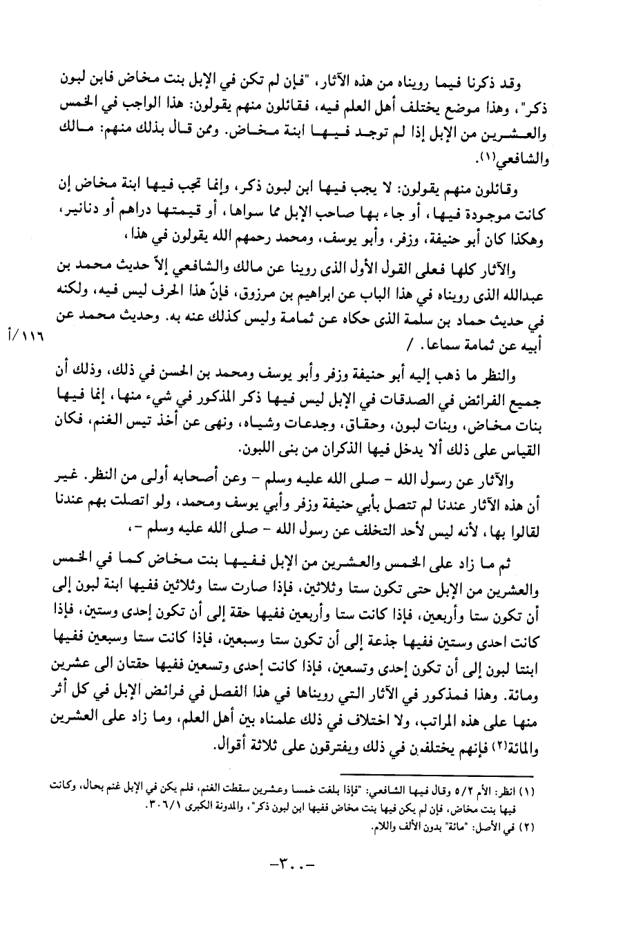 وَقَدْ ذَكَرْنَا فِيمَا رُوِّينَاهُ مِنْ هَذِهِ الآثَارِ، " فَإِنْ لَمْ تَكُنْ فِي الإِبِلِ بِنْتُ مَخَاضٍ فَابْنُ لَبُونٍ ذَكَرٌ "، وَهَذَا مَوْضِعٌ يَخْتَلِفُ أَهْلُ الْعِلْمِ فِيهِ، فَقَائِلُونَ مِنْهُمْ يَقُولُونَ: هَذَا الْوَاجِبُ فِي الْخَمْسِ وَالْعِشْرِينَ مِنَ الإِبِلِ إِذَا لَمْ تُوجَدْ فِيهَا ابْنَةُ مَخَاضٍ وَمِمَّنْ قَالَ بِذَلِكَ مِنْهُمْ: مَالِكٌ، وَالشَّافِعِيُّ وَقَائِلُونَ مِنْهُمْ يَقُولُونَ: لَا يَجِبُ فِيهَا ابْنُ لَبُونٍ ذَكَرٌ، وَإِنَّمَا تَجِبُ فِيهَا ابْنَةُ مَخَاضٍ إِنْ كَانَتْ مَوْجُودَةً فِيهَا، أَوْ جَاءَ بِهَا صَاحِبُ الإِبِلِ مِمَّا سِوَاهَا، أَوْ قَيِمَتُهَا دَرَاهِمُ أَوْ دَنَانِيرُ، وَهَكَذَا كَانَ أَبُو حَنِيفَةَ، وَزُفَرُ، وَأَبُو يُوسُفَ، وَمُحَمَّدٌ رَحِمَهُمُ اللهُ يَقُولُونَ فِي هَذَا، وَالآثَارُ كُلُّهَا فَعَلَى الْقَوْلِ الأَوَّلِ الَّذِي رُوِّينَا عَنْ مَالِكٍ، وَالشَّافِعِيِّ إِلا حَدِيثُ مُحَمَّدِ بْنِ عَبْدِ اللهِ الَّذِي رُوِّينَاهُ فِي هَذَا الْبَابِ عَنْ إِبْرَاهِيمَ بْنِ مَرْزُوقٍ، فَإِنَّ هَذَا الْحَرْفَ لَيْسَ فِيهِ، وَلَكِنَّهُ فِي حَدِيثِ حَمَّادِ بْنِ سَلَمَةَ الَّذِي حَكَاهُ عَنْ ثُمَامَةَ
