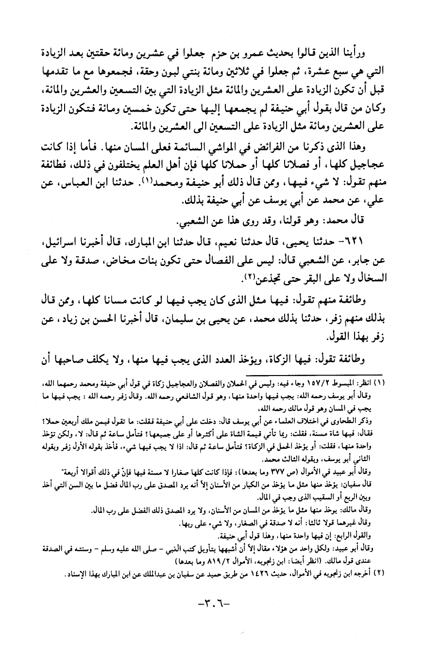 621 - حَدَّثَنَا يَحْيَى، قَالَ: حَدَّثَنَا نُعَيْمٌ، قَالَ: حَدَّثَنَا ابْنُ الْمُبَارَكِ، قَالَ: أَخْبَرَنَا إِسْرَائِيلُ، عَنْ جَابِرٍ، عَنِ الشَّعْبِيِّ، قَالَ: " لَيْسَ عَلَى الْفِصَالِ حَتَّى تَكُونَ بَنَاتَ مَخَاضٍ صَدَقَةٌ وَلا عَلَى السِّخَالِ وَلا عَلَى الْبَقَرِ حَتَّى تُجْذِعَنَّ " وَطَائِفَةٌ مِنْهُمْ تَقُولُ: فِيهَا مِثْلُ الَّذِي كَانَ يَجِبُ فِيهَا لَوْ كَانَتْ مَسَانًّا كُلُّهَا، وَمِمَّنْ قَالَ بِذَلِكَ مِنْهُمْ: زُفَرُ، حَدَّثَنَا بِذَلِكَ مُحَمَّدٌ عَنْ يَحْيَى بْنِ سُلَيْمَانَ، قَالَ: أَخْبَرَنَا الْحَسَنُ بْنُ زِيَادٍ، عَنْ زُفَرَ بِهَذَا الْقَوْلِ وَطَائِفَةٌ تَقُولُ: فِيهَا الزَّكَاةُ، وَيُؤْخَذُ الْعَدَدُ الَّذِي يَجِبُ فِيهَا مِنْهَا، وَلا يُكَلَّفُ صَاحِبُهَا أَنْ