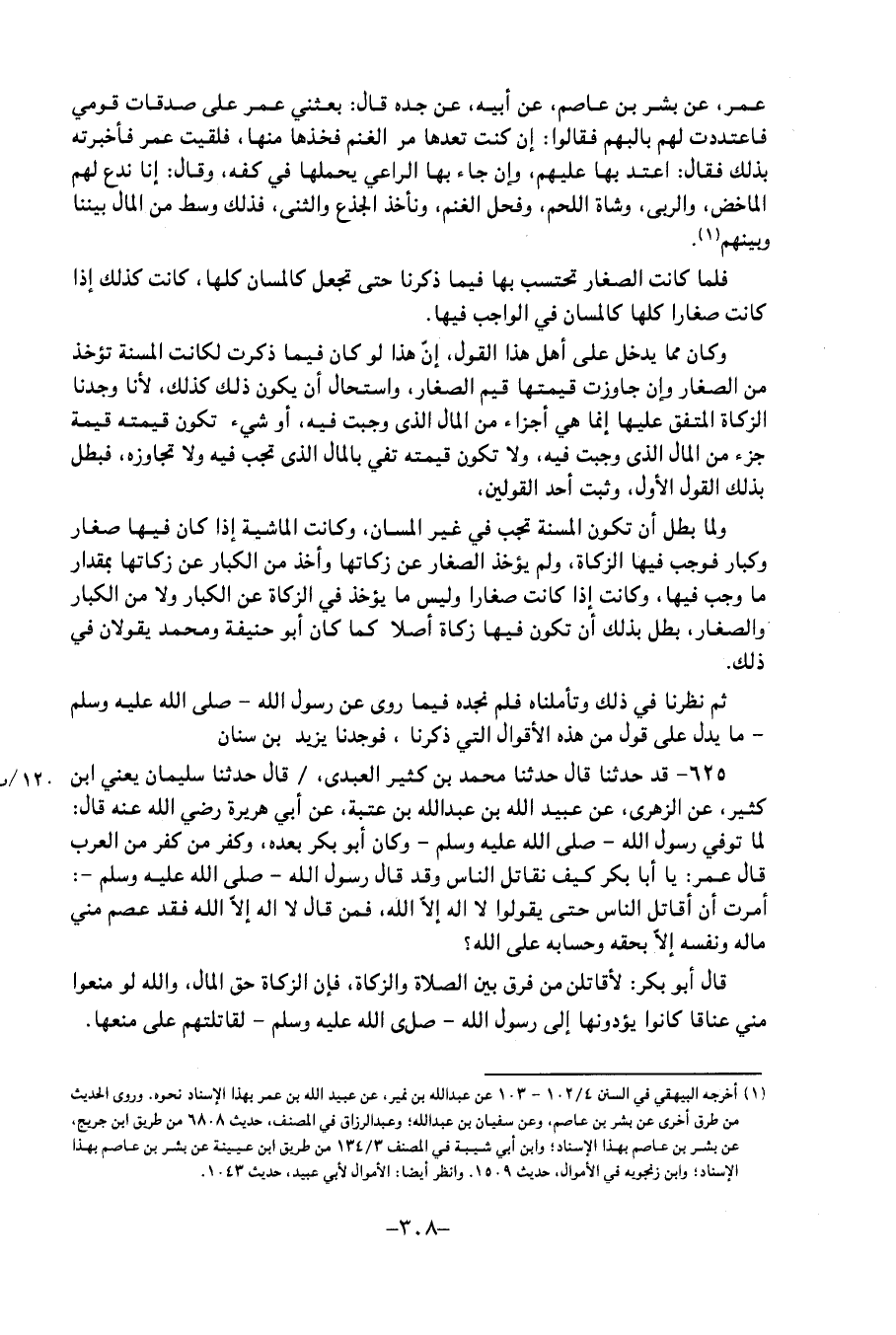 عُمَرَ، عَنْ بِشْرِ بْنِ عَاصِمٍ، عَنْ أَبِيهِ، عَنْ جَدِّهِ، قَالَ: بَعَثَنِي عُمَرُ عَلَى صَدَقَاتِ قَوْمِي، فَاعْتَدَدْتُ لَهُمْ بِالْبُهْمِ، فَقَالُوا: إِنْ كُنْتَ تَعُدُّهَا مِنَ الْغَنَمِ فَخُذْهَا مِنْهَا، فَلَقِيتُ عُمَرَ، فَأَخْبَرْتُهُ بِذَلِكَ، فَقَالَ: " اعْتَدَّ بِهَا عَلَيْهِمْ، وَإِنْ جَاءَ بِهَا الرَّاعِي يَحْمِلُهَا فِي كَفِّهِ " وَقَالَ: " إِنَّا نَدَعُ لَهُمُ الْمَاخِضَ، وَالرُّبَّى، وَشَاةَ اللَّحْمِ، وَفَحْلَ الْغَنَمِ، وَنَأْخُذُ الْجَذَعَ، وَالثَّنِيَّ، فَذَلِكَ وَسَطٌ مِنَ الْمَالِ بَيْنَنَا وَبَيْنَهُمْ " فَلَمَّا كَانَتِ الصِّغَارُ تُحْتَسَبُ بِهَا فِيمَا ذَكَرْنَا حَتَّى تُجْعَلَ كَالْمَسَانِّ كُلِّهَا، كَانَتْ كَذَلِكَ إِذَا كَانَتْ صِغَارًا كُلُّهَا كَالْمَسَانِّ فِي الْوَاجِبِ فِيهَا وَكَانَ مِمَّا يَدْخُلُ عَلَى أَهْلِ هَذَا الْقَوْلِ، أَنَّ هَذَا لَوْ كَانَ فِيمَا ذَكَرْتَ، لَكَانَتِ الْمُسِنَّةُ تُؤْخَذُ مِنَ الصِّغَارِ وَإِنْ جَاوَزَتْ قِيمَتُهَا قِيَمَ الصِّغَارِ، وَاسْتَحَالَ أَنْ يَكُونَ ذَلِكَ كَذَلِكَ، لأَنَّا وَجَدْنَا الزَّكَاةَ الْمُتَّفَقَ عَلَيْهَا، إِنَّمَا هِيَ أَجْزَاءٌ مِنَ الْمَالِ الَّذِي وَجَبَتْ فِيهِ، أَوْ شَيْءٌ تَكُونُ قِيمَتُهُ قِيمَةَ جُزْءٍ مِنَ الْمَالِ الَّذِي وَجَبَتْ فِيهِ، وَلا تَكُونُ قِيمَةً تَفِي بِالْمَالِ الَّذِي تَجِبُ فِيهِ وَلا تُجَاوِزُهُ، فَبَطَلَ بِذَلِكَ الْقَوْلُ الأَوَّلُ، وَثَبَتَ أَحَدُ الْقَوْلَيْنِ، وَلَمَّا بَطَلَ أَنْ تَكُونَ الْمُسِنَّةُ تَجِبُ فِي غَيْرِ الْمَسَانِّ، وَكَانَتِ الْمَاشِيَةُ إِذَا كَانَ فِيهَا صِغَارٌ وَكِبَارٌ فَوَجَبَ فِيهَا الزَّكَاةُ، وَلَمْ يُؤْخَذِ الصِّغَارُ عَنْ زَكَاتِهَا وَأُخِذَ مِنَ الْكِبَارِ عَنْ زَكَاتِهَا بِمِقْدَارِ مَا وَجَبَ فِيهَا، وَكَانَتْ إِذَا كَانَتْ صِغَارًا وَلَيْسَ مَا يُؤْخَذُ فِي الزَّكَاةِ عَنِ الْكِبَارِ، وَلا مِنَ الْكِبَارِ وَالصِّغَارِ، بَطَلَ بِذَلِكَ أَنْ تَكُونَ فِيهَا زَكَاةٌ أَصْلا، كَمَا كَانَ أَبُو حَنِيفَةَ، وَمُحَمَّدٌ يَقُولانِ فِي ذَلِكَ