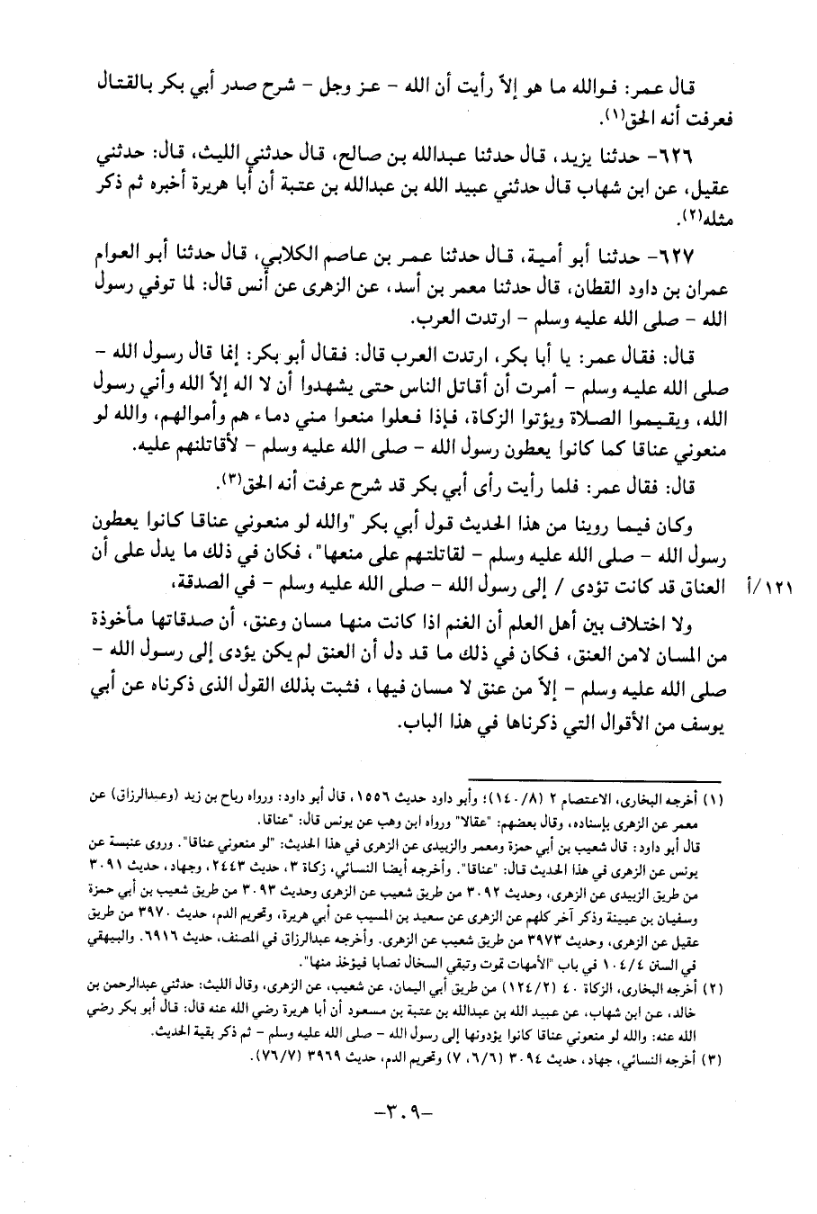 627 - حَدَّثَنَا أَبُو أُمَيَّةَ، قَالَ: حَدَّثَنَا عُمَرُ بْنُ عَاصِمٍ الْكِلابِيُّ، قَالَ: حَدَّثَنَا أَبُو الْعَوَّامِ عِمْرَانُ بْنُ دَاوُدَ الْقَطَّانُ، قَالَ: حَدَّثَنَا مَعْمَرُ بْنُ أَسَدٍ، عَنِ الزُّهْرِيِّ، عَنْ أَنَسٍ، قَالَ: لَمَّا تُوُفِّيَ رَسُولُ اللهِ صَلَّى اللَّهُ عَلَيْهِ وَسَلَّمَ ارْتَدَّتِ الْعَرَبُ، قَالَ: فَقَالَ عُمَرُ: يَا أَبَا بَكْرٍ، ارْتَدَّتِ الْعَرَبُ، قَالَ: فَقَالَ أَبُو بَكْرٍ: إِنَّمَا قَالَ رَسُولُ اللهِ صَلَّى اللَّهُ عَلَيْهِ وَسَلَّمَ: " أُمِرْتُ أَنْ أُقَاتِلَ النَّاسَ حَتَّى يَشْهَدُوا أَنْ لَا إِلَهَ إِلا اللهُ وَأَنِّي رَسُولُ اللهِ، وَيُقِيمُوا الصَّلاةَ، وَيُؤْتُوا الزَّكَاةَ، فَإِذَا فَعَلُوا مَنَعُوا مِنِّي دِمَاءَهُمْ وَأَمْوَالَهُمْ " وَاللهِ لَوْ مَنَعُونِي عَنَاقًا كَمَا كَانُوا يُعْطُونَ رَسُولَ اللهِ صَلَّى اللَّهُ عَلَيْهِ وَسَلَّمَ لأُقَاتِلَنَّهُمْ عَلَيْهِ، قَالَ: فَقَالَ عُمَرُ: فَلَمَّا رَأَيْتُ رَأْيَ أَبِي بَكْرٍ قَدْ شُرِحَ عَرَفْتُ أَنَّهُ الْحَقُّ وَكَانَ فِيمَا رُوِّينَا مِنْ هَذَا الْحَدِيثِ قَوْلُ أَبِي بَكْرٍ: وَاللهِ لَوْ مَنَعُونِي عَنَاقًا كَانُوا يُعْطُونَ رَسُولَ اللهِ صَلَّى اللَّهُ عَلَيْهِ وَسَلَّمَ لَقَاتَلْتُهُمْ عَلَى مَنْعِهَا، فَكَانَ فِي ذَلِكَ مَا يَدُلُّ عَلَى أَنَّ الْعَنَاقَ قَدْ كَانَتْ تُؤَدَّى إِلَى رَسُولِ اللهِ صَلَّى اللَّهُ عَلَيْهِ وَسَلَّمَ فِي الصَّدَقَةِ، وَلا اخْتِلافَ بَيْنَ أَهْلِ الْعِلْمِ أَنَّ الْغَنَمَ إِذَا كَانَتْ مِنْهَا مَسَانٌّ وَعَنَقٌ، أَنَّ صَدَقَاتِهَا مَأْخُوذَةٌ مِنَ الْمَسَانِّ لَا مِنَ الْعَنَقِ، فَكَانَ فِي ذَلِكَ مَا قَدْ دَلَّ أَنَّ الْعَنَقَ لَمْ يَكُنْ يُؤَدَّى إِلَى رَسُولِ اللهِ صَلَّى اللَّهُ عَلَيْهِ وَسَلَّمَ إِلا مِنْ عَنَقٍ لَا مَسَانَّ فِيهَا، فَثَبَتَ بِذَلِكَ الْقَوْلُ الَّذِي ذَكَرْنَاهُ عَنْ أَبِي يُوسُفَ مِنَ الأَقْوَالِ الَّتِي ذَكَرْنَاهَا فِي هَذَا الْبَابِ