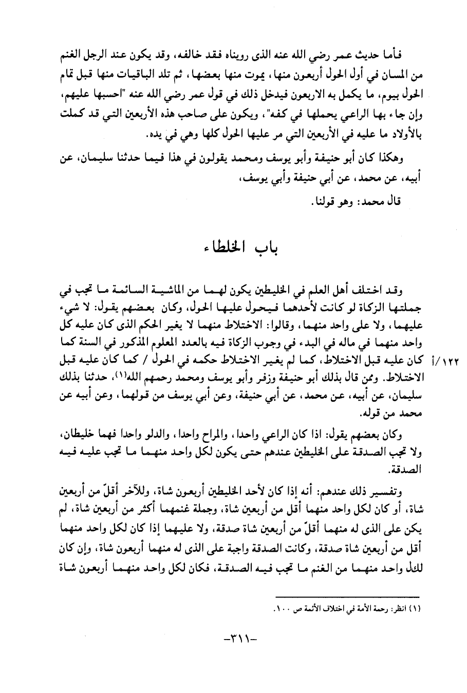 فَأَمَّا حَدِيثُ عُمَرَ رَضِيَ اللهُ عَنْهُ الَّذِي رُوِّينَاهُ فَقَدْ خَالَفَهُ، وَقَدْ يَكُونُ عِنْدَ الرَّجُلِ الْغَنَمُ مِنَ الْمَسَانِّ فِي أَوَّلِ الْحَوْلِ أَرْبَعُونَ مِنْهَا، يَمُوتُ مِنْهَا بَعْضُهَا، ثُمَّ تَلِدُ الْبَاقِيَاتُ مِنْهَا قَبْلَ تَمَامِ الْحَوْلِ بِيَوْمٍ، مَا يَكْمُلُ بِهِ الأَرْبَعُونَ فَيَدْخُلُ ذَلِكَ فِي قَوْلِ عُمَرَ رَضِيَ اللهُ عَنْهُ: " احْسِبْهَا عَلَيْهِمْ، وَإِنْ جَاءَ بِهَا الرَّاعِي يَحْمِلُهَا فِي كَفِّهِ "، وَيَكُونُ عَلَى صَاحِبِ هَذِهِ الأَرْبَعِينَ الَّتِي قَدْ كَمُلَتْ بِالأَوْلادِ مَا عَلَيْهِ فِي الأَرْبَعِينَ الَّتِي مَرَّ عَلَيْهَا الْحَوْلُ كُلِّهَا وَهِيَ فِي يَدِهِ وَهَكَذَا كَانَ أَبُو حَنِيفَةَ، وَأَبُو يُوسُفَ، وَمُحَمَّدٌ، يَقُولُونَ فِي هَذَا فِيمَا حَدَّثَنَا سُلَيْمَانُ، عَنْ أَبِيهِ، عَنْ مُحَمَّدٍ، عَنْ أَبِي حَنِيفَةَ، وأَبِي يُوسُفَ، قَالَ مُحَمَّدٌ: وَهُوَ قَوْلُنَا