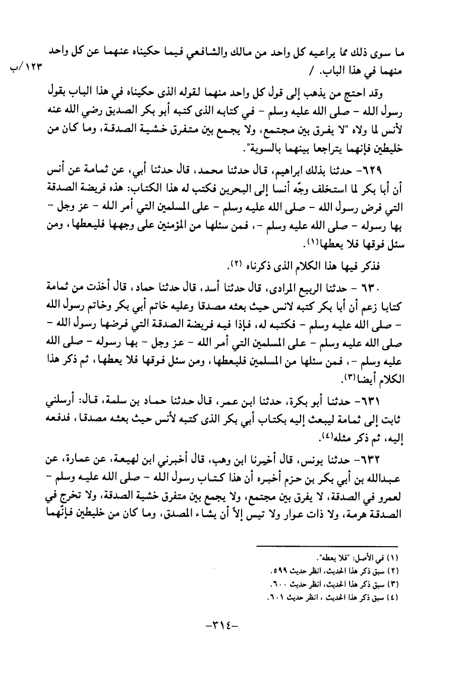 مَا سِوَى ذَلِكَ مِمَّا يُرَاعِيهِ كُلُّ وَاحِدٍ مِنْ مَالِكٍ، وَالشَّافِعِيِّ فِيمَا حَكَيْنَاهُ عَنْهُمَا عَنْ كُلِّ وَاحِدٍ مِنْهُمَا فِي هَذَا الْبَابِ وَقَدِ احْتَجَّ مَنْ يَذْهَبُ إِلَى قَوْلِ كُلِّ وَاحِدٍ مِنْهُمَا لِقَوْلِهِ الَّذِي حَكَيْنَاهُ فِي هَذَا الْبَابِ بِقَوْلِ رَسُولِ اللهِ صَلَّى اللَّهُ عَلَيْهِ وَسَلَّمَ فِي كِتَابِهِ الَّذِي كَتَبَهُ أَبُو بَكْرٍ الصِّدِّيقُ رَضِيَ اللهُ عَنْهُ لأَنَسٍ لَمَّا وَلاهُ: " لَا يُفَرَّقُ بَيْنَ مُجْتَمِعٍ، وَلا يُجْمِعُ بَيْنَ مُتَفَرِّقٍ خَشْيَةَ الصَّدَقَةِ، وَمَا كَانَ مِنْ خَلِيطَيْنِ فَإِنَّهُمَا