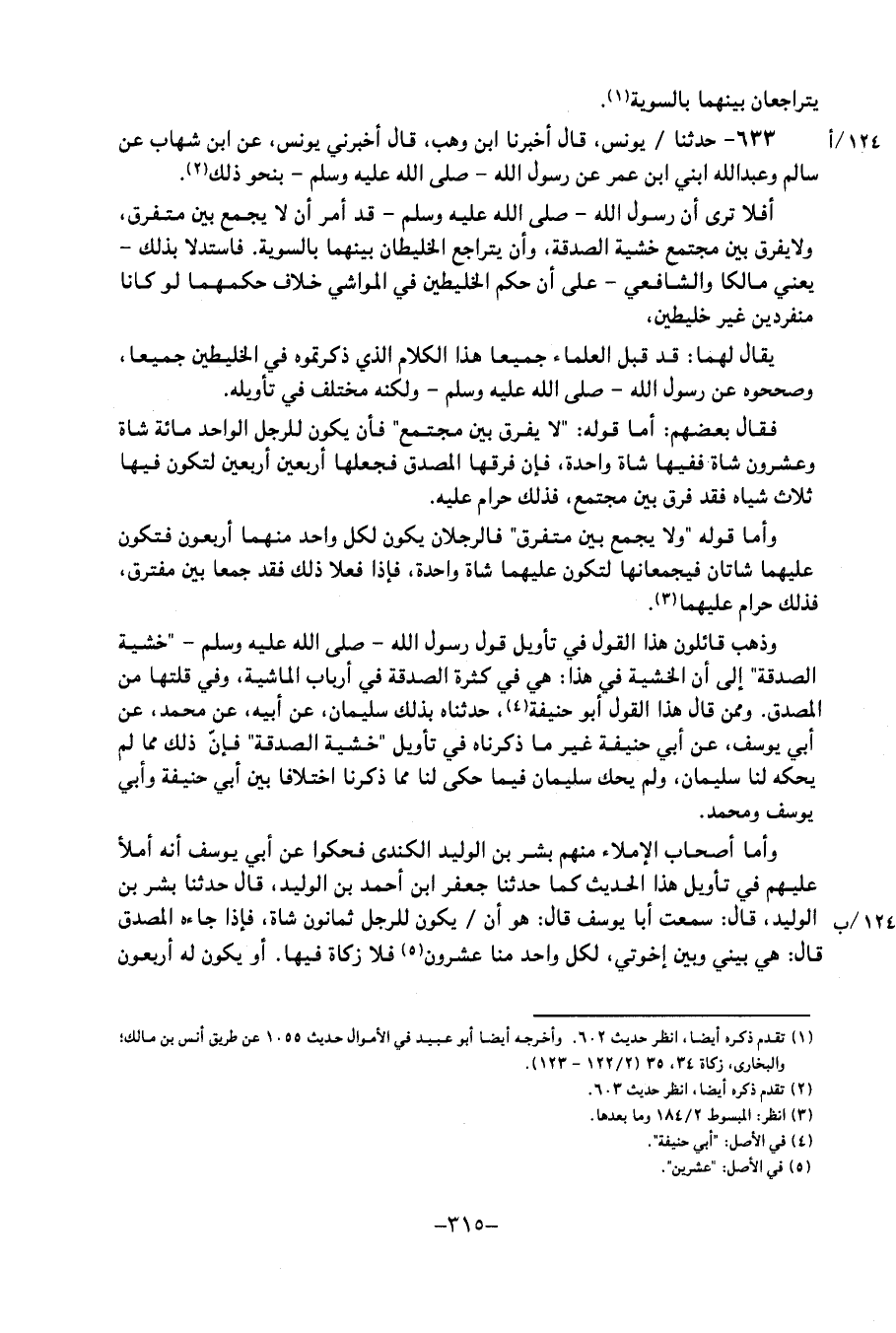 633 - حَدَّثَنَا يُونُسُ، قَالَ: أَخْبَرَنَا ابْنُ وَهْبٍ، قَالَ: أَخْبَرَنِي يُونُسُ، عَنِ ابْنِ شِهَابٍ، عَنْ سَالِمٍ، وَعَبْدِ اللهِ ابْنَيِ ابْنِ عُمَرَ، عَنْ رَسُولِ اللهِ صَلَّى اللَّهُ عَلَيْهِ وَسَلَّمَ، بِنَحْوِ ذَلِكَ أَفَلا تَرَى أَنَّ رَسُولَ اللهِ صَلَّى اللَّهُ عَلَيْهِ وَسَلَّمَ قَدْ أَمَرَ أَنْ لَا يُجْمَعَ بَيْنَ مُتَفَرِّقٍ، وَلا يُفَرَّقَ بَيْنَ مُجْتَمِعٍ خَشْيَةَ الصَّدَقَةِ، وَأَنْ يَتَرَاجَعَ الْخَلِيطَانِ بَيْنَهُمَا بِالسَّوِيَّةِ، فَاسْتَدَلا بِذَلِكَ يَعْنِي: مَالِكًا، وَالشَّافِعِيَّ، عَلَى أَنَّ حُكْمَ الْخَلِيطَيْنِ فِي الْمَوَاشِي خِلافُ حُكْمِهِمَا لَوْ كَانَا مُنْفَرِدَيْنِ غَيْرَ خَلِيطَيْنِ، يُقَالُ لَهُمَا: قَدْ قَبِلَ الْعُلَمَاءُ جَمِيعًا هَذَا الْكَلامَ الَّذِي ذَكَرْتُمُوهُ فِي الْخَلِيطَيْنِ جَمِيعًا، وَصَحَّحُوهُ عَنْ رَسُولِ اللهِ صَلَّى اللَّهُ عَلَيْهِ وَسَلَّمَ، وَلَكِنَّهُ مُخْتَلَفٌ فِي تَأْوِيلِهِ فَقَالَ بَعْضُهُمْ: أَمَّا قَوْلُهُ: " لَا يُفَرَّقُ بَيْنَ مُجْتَمِعٍ "، فَأَنْ يَكُونَ لِلرَّجُلِ الْوَاحِدِ مِائَةُ شَاةٍ وَعِشْرُونَ شَاةً، فَفِيهَا شَاةٌ وَاحِدَةٌ، فَإِنْ فَرَّقَهَا الْمُصَّدِّقُ جَعَلَهَا أَرْبَعِينَ أَرْبَعِينَ، لِتَكُونَ فِيهَا ثَلاثُ شِيَاهٍ فَقَدْ فَرَّقَ بَيْنَ مُجْتَمِعٍ، فَذَلِكَ حَرَامٌ عَلَيْهِ وَأَمَّا قَوْلُهُ: " وَلا يُجْمَعُ بَيْنَ مُتَفَرِّقٍ "، فَالرَّجُلانِ يَكُونُ لِكُلِّ وَاحِدٍ مِنْهُمَا أَرْبَعُونَ، فَتَكُونُ عَلَيْهِمَا شَاتَانِ فَيَجْمَعَانِهَا لِتَكُونَ عَلَيْهِمَا شَاةٌ وَاحِدَةٌ، فَإِذَا فَعَلا ذَلِكَ فَقَدْ جَمَعَا بَيْنَ مُتَفَرِّقٍ، فَذَلِكَ حَرَامٌ عَلَيْهِمَا وَذَهَبَ قَائِلُوا هَذَا الْقَوْلِ فِي تَأْوِيلِ قَوْلِ رَسُولِ اللهِ صَلَّى اللَّهُ عَلَيْهِ وَسَلَّمَ: " خَشْيَةَ الصَّدَقَةِ "، إِلَى أَنَّ الْخَشْيَةَ فِي هَذَا: هِيَ فِي كَثْرَةِ الصَّدَقَةِ فِي أَرْبَابِ الْمَاشِيَةِ، وَفِي قِلَّتِهَا مِنَ الْمُصَدِّقِ، وَمِمَّنْ قَالَ هَذَا الْقَوْلَ أَبُو حَنِيفَةَ، حَدَّثَنَاهُ بِذَلِكَ سُلَيْمَانُ، عَنْ أَبِيهِ، عَنْ مُحَمَّدٍ، عَنْ أَبِي يُوسُفَ، عَنْ أَبِي حَنِيفَةَ غَيْرَ مَا ذَكَرْنَاهُ فِي تَأْوِيلِ " خَشْيَةَ الصَّدَقَةِ "، فَإِنَّ ذَلِكَ مِمَّا لَمْ يَحْكِهِ لَنَا سُلَيْمَانُ، وَلَمْ يَحْكِ سُلَيْمَانُ فِيمَا حَكَى لَنَا مِمَّا ذَكَرْنَا اخْتِلافًا بَيْنَ أَبِي حَنِيفَةَ، وَأَبِي يُوسُفَ، وَمُحَمَّدٍ