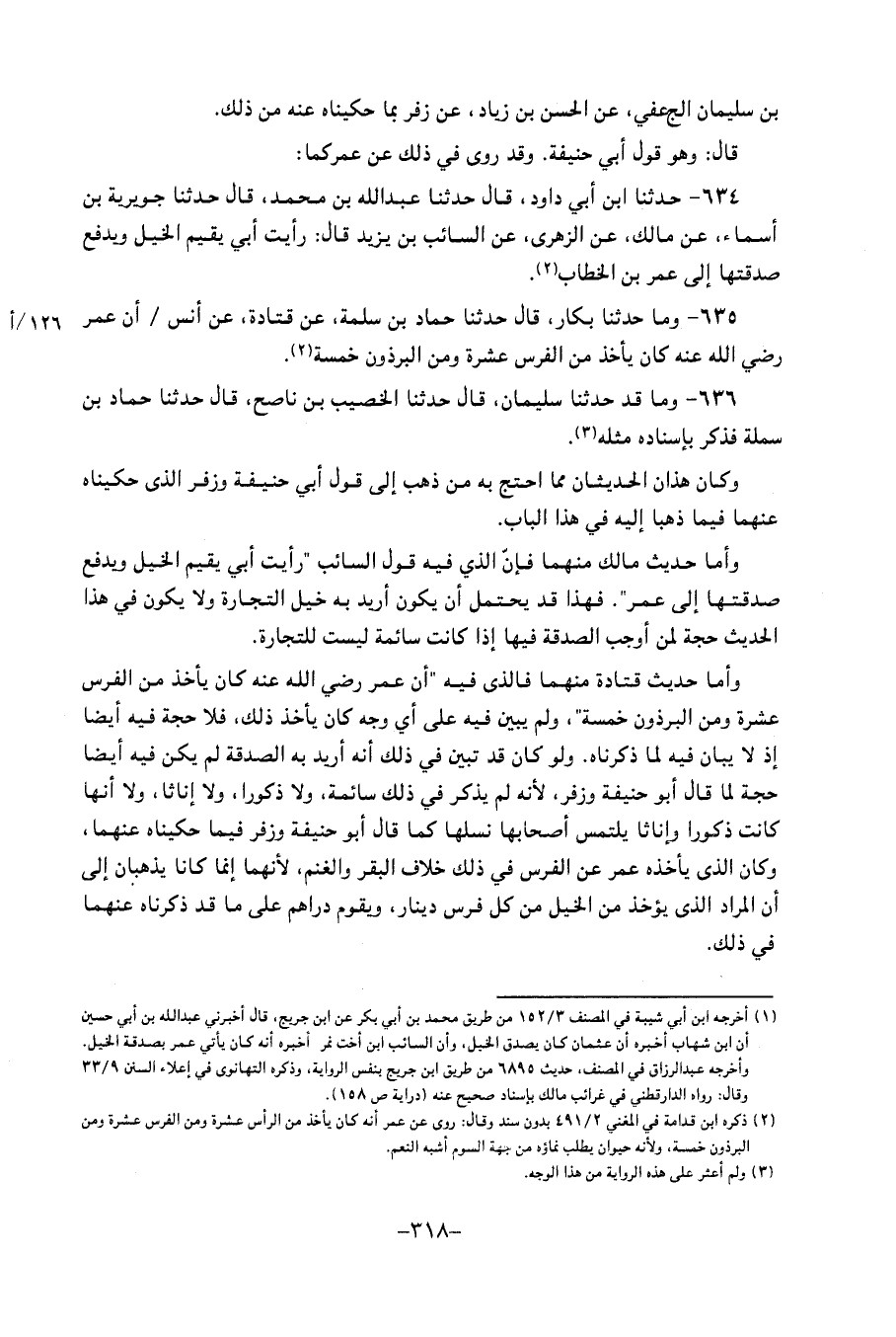 636 - وَمَا قَدْ حَدَّثَنَا سُلَيْمَانُ، قَالَ: حَدَّثَنَا الْخَصِيبُ بْنُ نَاصِحٍ، قَالَ: حَدَّثَنَا حَمَّادُ بْنُ سَلَمَةَ، فَذَكَرَ بِإِسْنَادِهِ مِثْلَهُ وكَانَ هَذَانِ الْحَدِيثَانِ مِمَّا احْتَجَّ بِهِ مَنْ ذَهَبَ إِلَى قَوْلِ أَبِي حَنِيفَةَ، وَزُفَرَ، الَّذِي حَكَيْنَاهُ عَنْهُمَا فِيمَا ذَهَبَا إِلَيْهِ فِي هَذَا الْبَابِ وَأَمَّا حَدِيثُ مَالكٍ مِنْهُمَا فَإِنَّ الَّذِي فِِيِه قَوْلَ السَّائِبِ: رَأَيْتُ أَبِي يُقِيمُ الْخَيْلَ وَيَدْفَعُ صَدَقَتَهَا إِلَى عُمَرَ، فَهَذَا قَدْ يُحْتَمَلُ أَنْ يَكُونَ أُرِيدَ بِهِ خَيْلُ التِّجَارَةِ، وَلا يَكُونُ فِي هَذَا الْحَدِيثِ حُجَّةٌ لِمَنْ أَوْجَبَ الصَّدَقَةَ فِيهَا إِذَا كَانَت سَائِمَةً لَيْسَتْ لِلتِّجَارَةِ وَأَمَّا حَدِيثُ قَتَادَةَ مِنْهُمَا فَالَّذِي فِيه: " أَنَّ عُمَرَ رَضِيَ اللهُ عَنْهُ كَانَ يَأْخُذُ مِنَ الْفَرَسِ عَشَرَةً وَمِنَ الْبِرْذَوْنِ خَمْسَةً "، وَلَمْ يُبَيِّنْ فِيه عَلَى أَيْ وَجْهٍ كَانَ يَأْخُذُ ذَلِكَ، فَلا حُجَّةَ فِيه أَيْضًا، إِذْ لَا يُبَانُ فِيه لِمَا ذَكَرْنَاهُ وَلَوْ كَانَ قَدْ تَبَيَّنَ فِي ذَلِكَ أَنَّهُ أُرِيدَ بِهِ الصَّدَقَةَ لَمْ يَكُنْ فِيه أَيْضًا حُجَّةٌ لِمَا قَالَ أَبُو حَنِيفَةَ، وَزُفَرُ، لأَنَّهُ لَمْ يَذْكُرْ فِي ذَلِكَ سَائِمَةً، وَلا ذُكُورًا، وَلا إِنَاثًا، وَلا أَنَّهَا كَانَتْ ذُكُورًا وَإِنَاثًا يَلْتَمِسُ أَصْحَابُهَا نَسْلَهَا، كَمَا قَالَ أَبُو حَنِيفَةَ، وَزُفَرُ، فِيمَا حَكَيْنَاهُ عَنْهُمَا، وكَانَ الَّذِي يَأْخُذُهُ عُمَرُ عَنِ الْفَرَسِ فِي ذَلِكَ خِلافَ الْبَقَرِ وَالْغَنَمِ، لأَنَّهُمَا إِنَّمَا كَانَ يَذْهَبَانِ إِلَى أَنَّ الْمُرَادَ الَّذِي يُؤْخَذُ مِنَ الْخَيْلِ مِنْ كُلِّ فَرَسٍ دِينَارٌ، وَيَقَوَّمُ دَرَاهِمَ عَلَى مَا قَدْ ذَكَرْنَاهُ عَنْهُمَا فِي ذَلِكَ