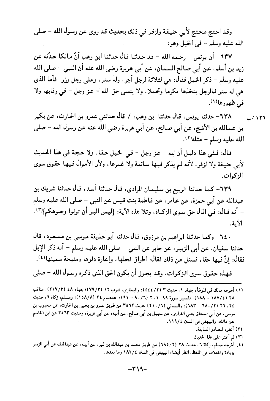 638 - حَدَّثَنَا يُونُسُ، قَالَ: حَدَّثَنَا ابْنُ وَهْبٍ، قَالَ: حَدَّثَنِي عَمْرُو بْنُ الْحَارِثِ، عَنْ بُكَيْرِ بْنِ عَبْدِ اللهِ بْنِ الأَشَجِّ، عَنْ أَبِي صَالِحٍ، عَنْ أَبِي هُرَيْرَةَ رَضِيَ اللهُ عَنْهُ، عَنْ رَسُولِ اللهِ صَلَّى اللَّهُ عَلَيْهِ وَسَلَّمَ، مِثْلَهُ قَالَ: ففِي هَذَا دَلِيل أَن لله عَزَّ وَجَلَّ فِي الْخَيل حَقًا وَلَا حجَّة فِي هَذَا الحَدِيث لأَبِي حَنِيفَةَ وَلَا لزفَر، لِأَنَّهُ لم يذكر فِيهَا سَائِمَة وَلَا غَيرهَا، وَلِأَن الْأَمْوَال فِيهَا حُقُوق سوى الزكوات
