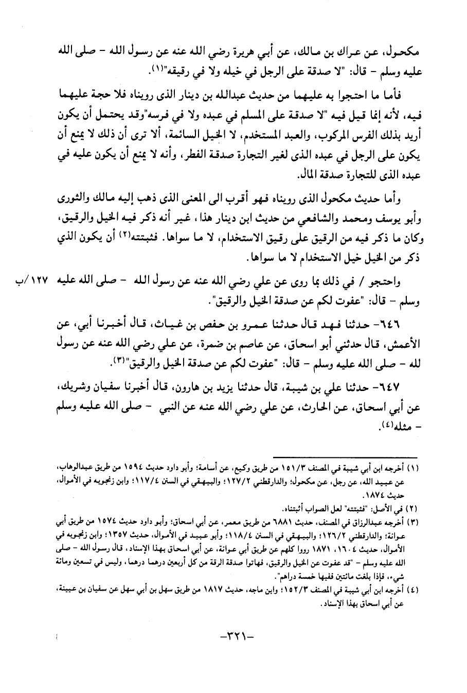 عَنْ مَكْحُولٍ، عَنْ عِرَاكِ بْنِ مَالِكٍ، عَنْ أَبِي هُرَيْرَةَ رَضِيَ اللهُ عَنْهُ، عَنْ رَسُولِ اللهِ صَلَّى اللَّهُ عَلَيْهِ وَسَلَّمَ، قَالَ: " لَا صَدَقَةَ عَلَى الرَّجُلِ فِي خَيْلِهِ وَلا فِي رَقِيقِهِ " فأمَا مَا احْتَجُّوا بِهِ عَلَيْهِمَا من حَدِيث عبد الله بن