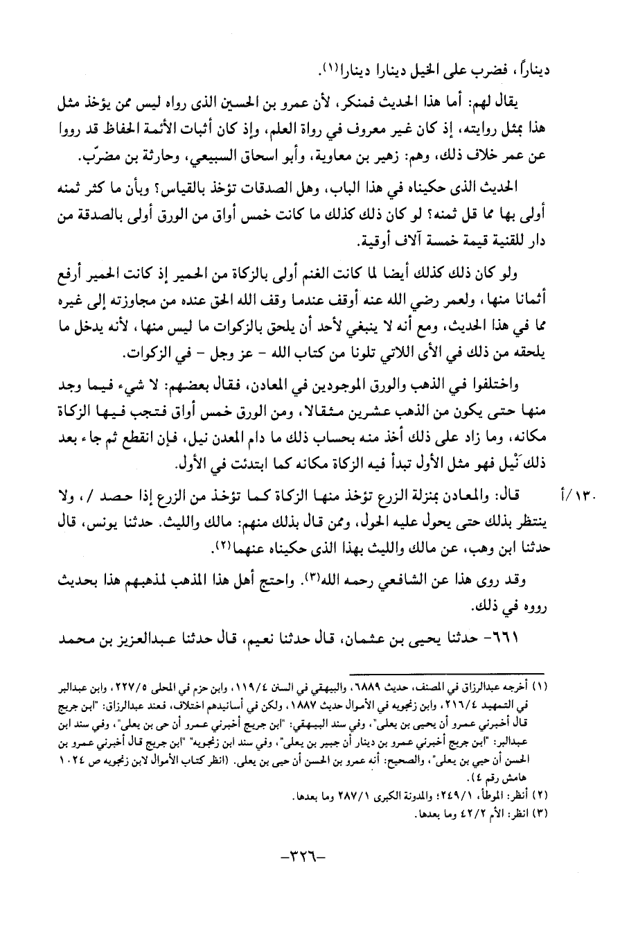 دِينَارًا " فَضَرَبَ عَلَى الْخَيْلِ دِينَارًا دِينَارًا يُقَالَ لَهُم: أمَّا هَذَا الحَدِيث فمنكر، لِأَن عَمْرو بن الْحُسَيْن الَّذِي رَوَاهُ لَيْسَ مِمَّنْ يُؤْخَذ مثل هَذَا بِمثل رِوَايَته، إِذْ كَانَ غير مَعْرُوف فِي رُوَاة الْعلم، وَإِذ كَانَ أثبات الْأَئِمَّة الْحفاظ قَدْ رووا عَنْ عمر خلاف ذَلِكَ، وهم: زُهَيْر بن مُعَاوِيَة، وَأَبُو إِسْحَاق السبيعِي، وحارثة بن مضرب الحَدِيث الَّذِي حكيناه فِي هَذَا الْبَاب، وَهل الصَّدقَات تُؤْخَذ بِالْقِيَاسِ؟ وَبِأَن مَا كثر ثمنه أولى بِهَا مِمَّا قل ثمنه؟ لَو كَانَ ذَلِكَ كَذَلِكَ مَا كَانَت خمس أَوَاقٍ من الْوَرق أولى بِالصَّدَقَةِ من دَار للْقنية قيمَة خَمْسَة آلَاف أُوقِيَّة وَلَو كَانَ ذَلِكَ كَذَلِكَ أَيْضا لمَا كَانَت الْغنم أولى بِالزَّكَاةِ من الْحمير، إِذْ كَانَت الْحمير أرفع أثمَانا مِنْهَا، ولعمر رَضِيَ اللهُ عَنْهُ أوقف