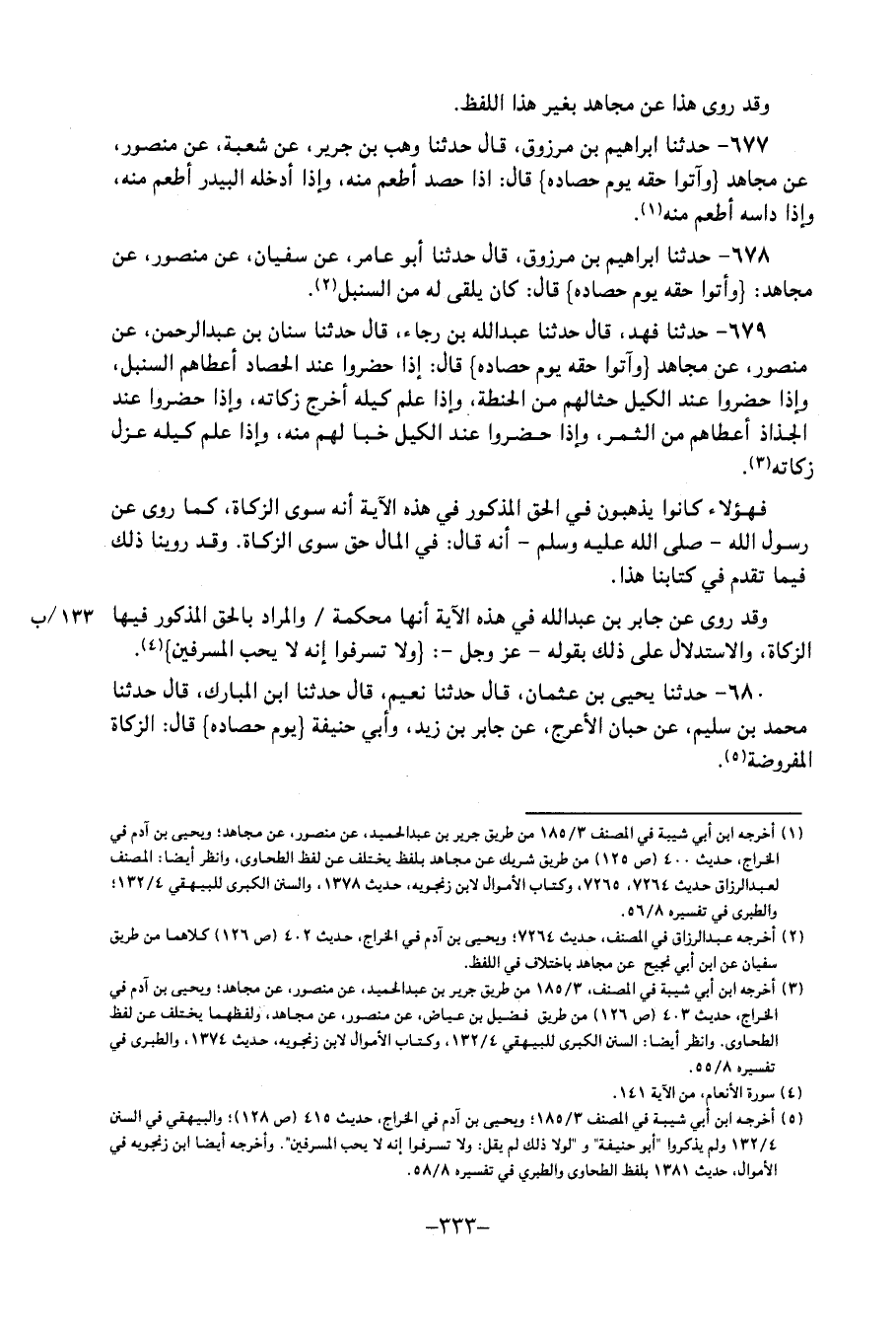 679 - حَدَّثَنَا فَهْدٌ، قَالَ: حَدَّثَنَا عَبْدُ اللهِ بْنُ رَجَاءٍ، قَالَ: حَدَّثَنَا سِنَانُ بْنُ عَبْدِ الرَّحْمَنِ، عَنْ مَنْصُورٍ، عَنْ مُجَاهِدٍ، {وَآتُوا حَقَّهُ يَوْمَ حَصَادِهِ} ، قَالَ: إِذَا حَضَرُوا عِنْدَ الْحَصَادِ أَعْطَاهُمُ السُّنْبُلَ، وَإِذَا حَضَرُوا عِنْدَ الْكَيْلِ حَثَا لَهُمْ مِنَ الْحِنْطَةِ، وَإِذَا عَلِمَ كَيْلَهُ أَخْرَجَ زَكَاتَهُ، وَإِذَا حَضَرُوا عِنْدَ الْجُذَاذِ أَعْطَاهُمْ مِنَ الثَّمَرِ، وَإِذَا حَضَرُوا عِنْدَ الْكَيْلِ خَبَا لَهُمْ مِنْهُ، وَإِذَا عَلِمَ كَيْلَهُ عَزَلَ زَكَاتَهُ فَهَؤُلَاءِ كَانُوا يذهبون فِي الْحق الْمَذْكُور فِي هَذِهِ الْآيَة أَنَّهُ سوى الزَّكَاة، كمَا رُوِيَ عَنْ رَسُول اللهِ صَلَّى اللَّهُ عَلَيْهِ وَسَلَّمَ