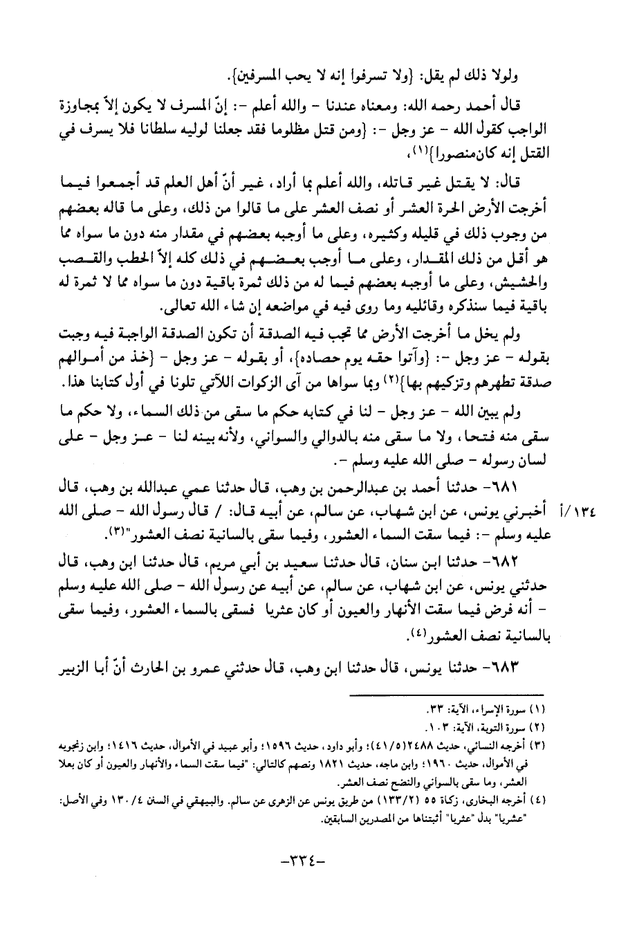 وَلَوْلا ذَلِكَ لَمْ يَقُلْ: {وَلا تُسْرِفُوا إِنَّهُ لَا يُحِبُّ الْمُسْرِفِينَ} قَالَ أَحْمد رَحمَه الله: وَمَعْنَاهُ عِنْدَنَا، وَالله أعلم: أَن المسرف لَا يكون إِلَّا بمجاوزة الْوَاجِب، كَقَوْل الله عَزَّ وَجَلَّ: {وَمَنْ قُتِلَ مَظْلُومًا فَقَدْ جَعَلْنَا لِوَلِيِّهِ سُلْطَانًا فَلا يُسْرِفْ فِي الْقَتْلِ إِنَّهُ كَانَ مَنْصُورًا} ، قَالَ: لَا يقتل غير قَاتله، وَالله أعلم بمَا أَرَادَ، غير أَن أهل الْعلم قَدْ أَجمعُوا فِيمَا أخرجت الأَرْض الْحرَّة الْعشْر أَو نصف الْعشْر عَلَى مَا قَالُوا من ذَلِكَ، وعَلَى مَا قَالَه بَعضهم من وجوب ذَلِكَ فِي قَلِيله وَكَثِيره، وعَلَى مَا أوجبه بَعضهم فِي مِقْدَار مِنْهُ دون مَا سواهُ مِمَّا هُوَ أقل من ذَلِكَ الْمِقْدَار، وعَلَى مَا أوجب بَعضهم فِي ذَلِكَ كُله إِلَّا الْحَطب والقصب والحشيش، وعَلَى مَا أوجبه بَعضهم فِيمَا لَهُ من ذَلِكَ ثَمَرَة بَاقِيَة دون مَا سواهُ مِمَّا لَا ثَمَرَة لَهُ بَاقِيَة فِيمَا سَنذكرُهُ وقائليه، ومَا رُوِيَ