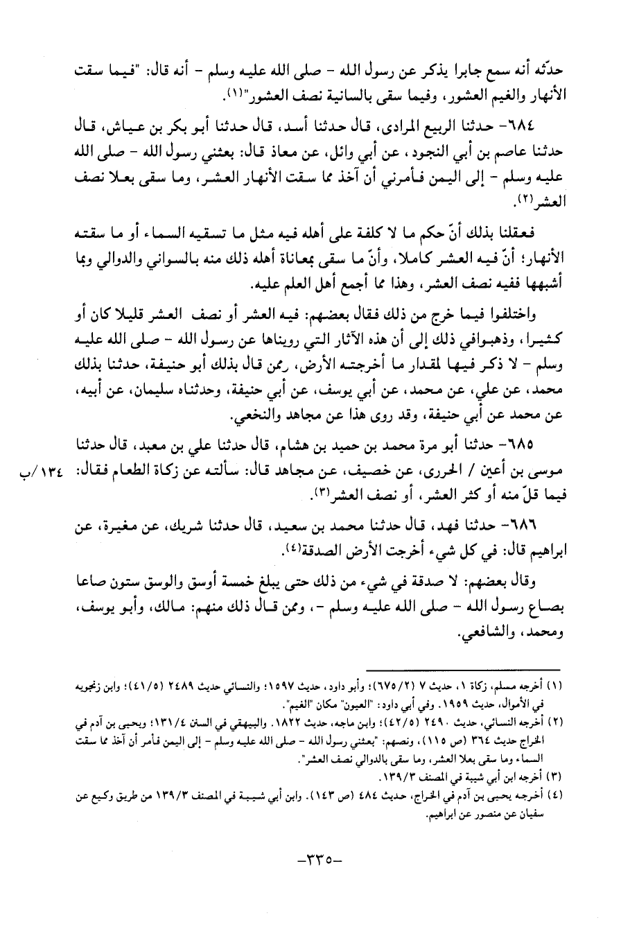684 - حَدَّثَنَا الرَّبِيعُ الْمُرَادِيُّ، قَالَ: حَدَّثَنَا أَسَدٌ، قَالَ: حَدَّثَنَا أَبُو بَكْرِ بْنُ عَيَّاشٍ، قَالَ: حَدَّثَنَا عَاصِمُ بْنُ أَبِي النَّجُودِ، عَنْ أَبِي وَائِلٍ، عَنْ مُعَاذٍ، قَالَ: بَعَثَنِي رَسُولُ اللهِ صَلَّى اللَّهُ عَلَيْهِ وَسَلَّمَ إِلَى الْيَمَنِ " فَأَمَرَنِي أَنْ آخُذَ مِمَّا سَقَتِ الأَنْهَارُ الْعُشْرَ، وَمَا سُقِيَ بَعْلا نِصْفَ الْعُشْرِ " فعقلنا بِذَلِكَ أَن حكم مَا لَا كلفة عَلَى أَهله فِيه مثل مَا تسقيه السمَاء، أَو مَا سقته الْأَنْهَار، أَن فِيه الْعشْر كَامِلا، وَأَن مَا سقِِي بمعاناة أَهله ذَلِكَ مِنْهُ بالسواني والدوالي، وبمَا أشبههَا ففِيه نصف الْعشْر، وَهَذَا ممَّا أجمع أهل الْعلم عَلَيْهِ وَاخْتلفُوا فِيمَا خرج من ذَلِكَ، فقَالَ بَعضهم: فِيه الْعشْر أَو نصف الْعشْر قَلِيلا كَانَ أَو كثيرا، وذهبوا فِي ذَلِكَ إِلَى أَن هَذِهِ الْآثَار الَّتِي رويناها عَنْ رَسُول اللهِ صَلَّى اللَّهُ عَلَيْهِ وَسَلَّمَ لَا ذكر فِيهَا لمقدار مَا أخرجته الأَرْض، وَمِمَّنْ قَالَ بذلك أَبُو حَنِيفَةَ، حَدَّثَنَا بِذَلِكَ مُحَمَّد، عَنْ عَليّ، عَنْ مُحَمَّد، عَنْ أَبِي يُوسُفَ، عَنْ أَبِي حَنِيفَةَ، وحَدَّثَنَاه سليمَان، عَنْ أَبِيهِ، عَنْ مُحَمَّد أَبِي حَنِيفَةَ، وقَدْ روى هَذَا عَنْ مُجَاهِد، والنخغي