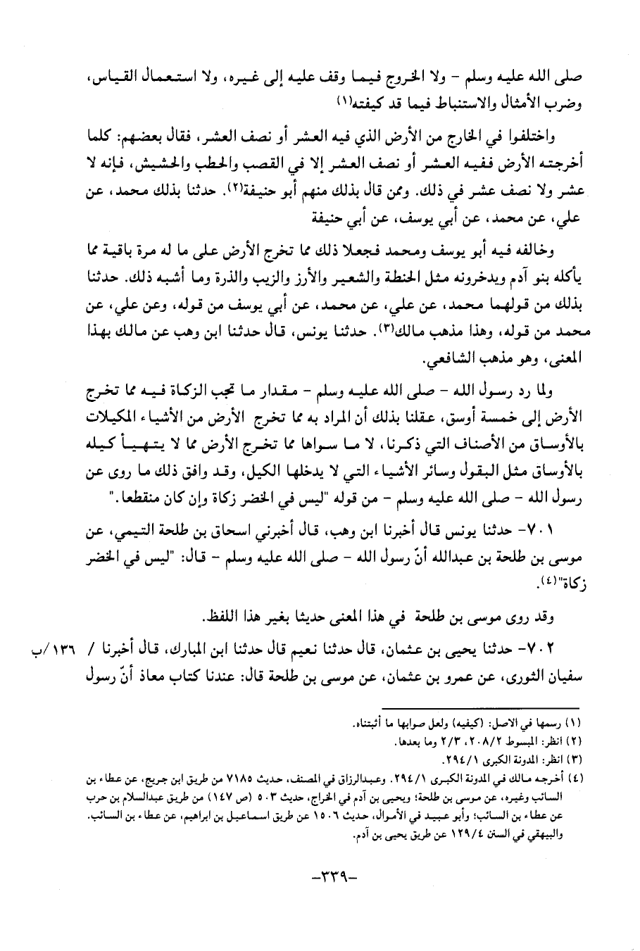 وَلَا الْخُرُوج فِيمَا وقف عَلَيْهِ إِلَى غَيره، وَلَا استعمَال الْقيَاس، وَضرب الْأَمْثَال والاستنباط فِيمَا قَدْ كيفته وَاخْتلفُوا فِي الْخَارِج من الأَرْض الَّذِي فِيه الْعشْر أَو نصف الْعشْر، فقَالَ بَعضهم: كل مَا أخرجته الأَرْض ففِيه الْعشْر، أَو نصف الْعشْر إِلَّا فِي الْقصب، والحطب، والحشيش، فَإِنَّهُ لَا عشر وَلَا نصف عشر فِي ذَلِكَ وَمِمَّنْ قَالَ بِذَلِكَ مِنْهُمْ: أَبُو حَنِيفَةَ، حَدَّثَنَا بِذَلِكَ مُحَمَّد عَنْ عَليّ، عَنْ مُحَمَّد، عَنْ أَبِي يُوسُفَ، عَنْ أَبِي حَنِيفَةَ، وَخَالفهُ فِيه أَبُو يُوسُف، وَمُحَمّد، فَجعلَا ذَلِكَ ممَّا تخرج الأَرْض عَلَى مَا لَهُ ثَمَرَة بَاقِيَة ممَّا يَأْكُلهُ بَنو آدم ويدخرونه مثل الْحِنْطَة، وَالشعِير، والأرز، وَالزَّبِيب، والذرة، ومَا أشبه ذَلِكَ حَدَّثَنَا بِذَلِكَ من قولهمَا مُحَمَّد، عَنْ عَليّ، عَنْ مُحَمَّد، عَنْ أَبِي يُوسُفَ من قَوْله، وَعَن عَليّ، عَنْ مُحَمَّد من قَوْله، وَهَذَا مَذْهَب مَالك حَدَّثَنَا يُونُس، قَالَ: حَدَّثَنَا ابْن وهب، عَنْ مَالك بِهَذَا الْمَعْنى، وَهُوَ مَذْهَب الشَّافِعِي ولمَّا رد رَسُول اللهِ صَلَّى اللَّهُ عَلَيْهِ وَسَلَّمَ مِقْدَار مَا تَجِبُ الزَّكَاة فِيه ممَّا تخرج