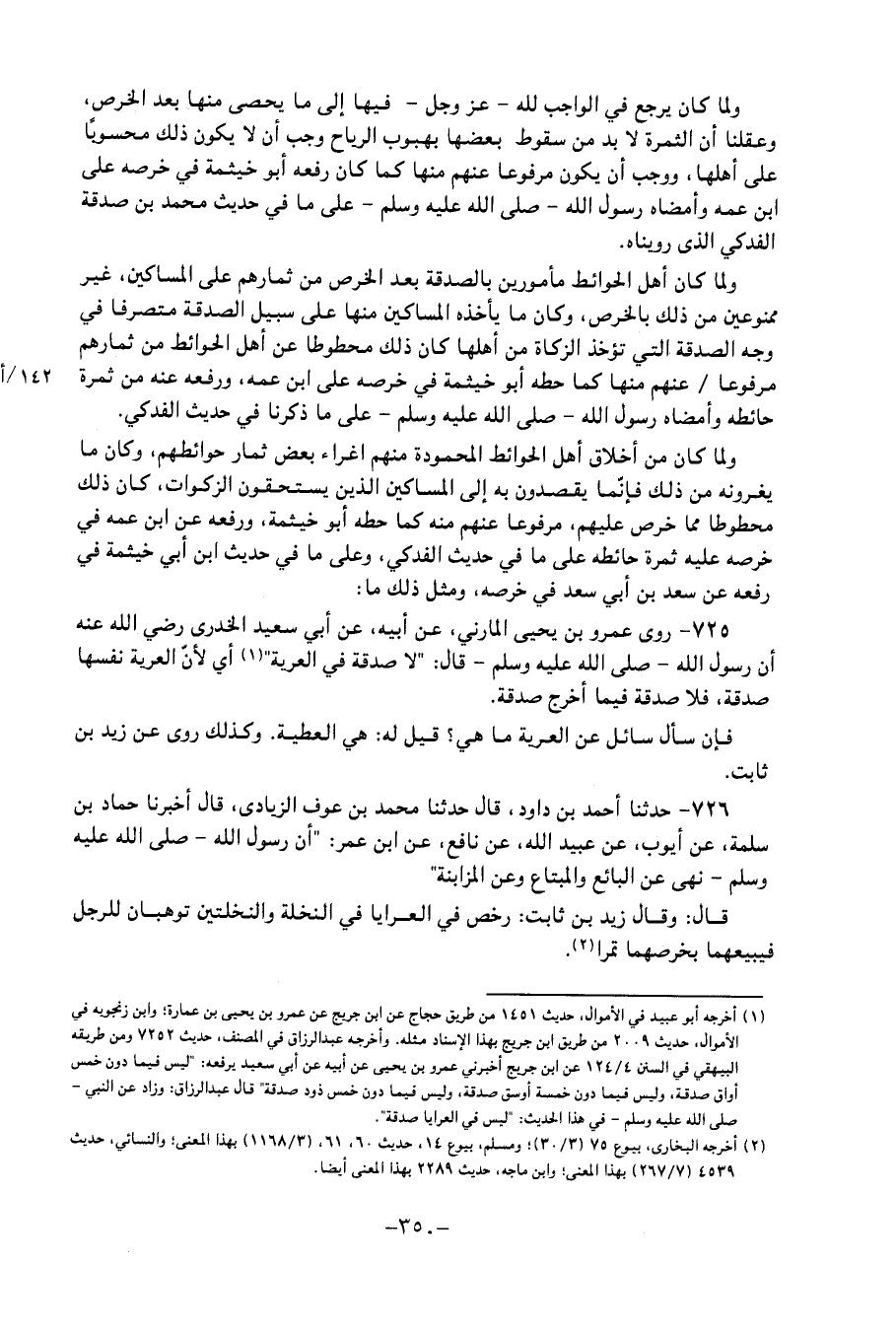 فِي خرصه عَلَى ابْن عَمه، وأمضاه رَسُول اللهِ صَلَّى اللَّهُ عَلَيْهِ وَسَلَّمَ عَلَى مَا فِي حَدِيث مُحَمَّد بن صَدَقَة الفدكي الَّذِي روينَاهُ ولمَّا كَانَ أهل الحوائط مَأمورين بِالصَّدَقَةِ بعد الْخرص من ثمَارهم عَلَى الْمَسَاكِين، غير ممنوعين من ذَلِكَ بالخرص، وكَانَ مَا يَأْخُذهُ الْمَسَاكِين مِنْهَا على سَبِيل الصَّدَقَة منصرفا فِي وَجه الصَّدَقَة الَّتِي تُؤْخَذ الزَّكَاة من أَهلهَا، كَانَ ذَلِكَ محطوطا عَنْ أهل الحوائط من ثمَارهم مَرْفُوعا عَنْهُم مِنْهَا، كمَا حطه أَبُو خَيْثَمَة فِي خرصه عَلَى ابْن عَمه، وَرَفعه عَنهُ من ثَمَرَة حَائِطه وأمضاه رَسُول اللهِ صَلَّى اللَّهُ عَلَيْهِ وَسَلَّمَ عَلَى مَا ذكرنَا فِي حَدِيث الفدكي ولمَّا كَانَ من أَخْلَاق أهل الحوائط المحمودة مِنْهُمْ إغراء بعض ثمَار حوائطهم، وكَانَ مَا يغرونه من ذَلِكَ فإنمَّا يقصدون بِهِ إِلَى الْمَسَاكِين الَّذين يسْتَحقُّونَ الزكوات، كَانَ ذَلِكَ محطوطا مِمَّا خرص عَلَيْهِم، مَرْفُوعا عَنْهُم مِنْهُ كمَا حطه أَبُو خَيْثَمَة، وَرَفعه عَنِ ابْنِ عَمه فِي خرصه عَلَيْهِ ثَمَرَة حَائِطه عَلَى مَا فِي حَدِيث الفدكي، وعَلَى مَا فِي حَدِيث ابْن أَبِي خَيْثَمَة فِي رَفعه عَنْ سعد بن أَبِي سعد فِي خرصه، وَمثل ذَلِكَ مَا