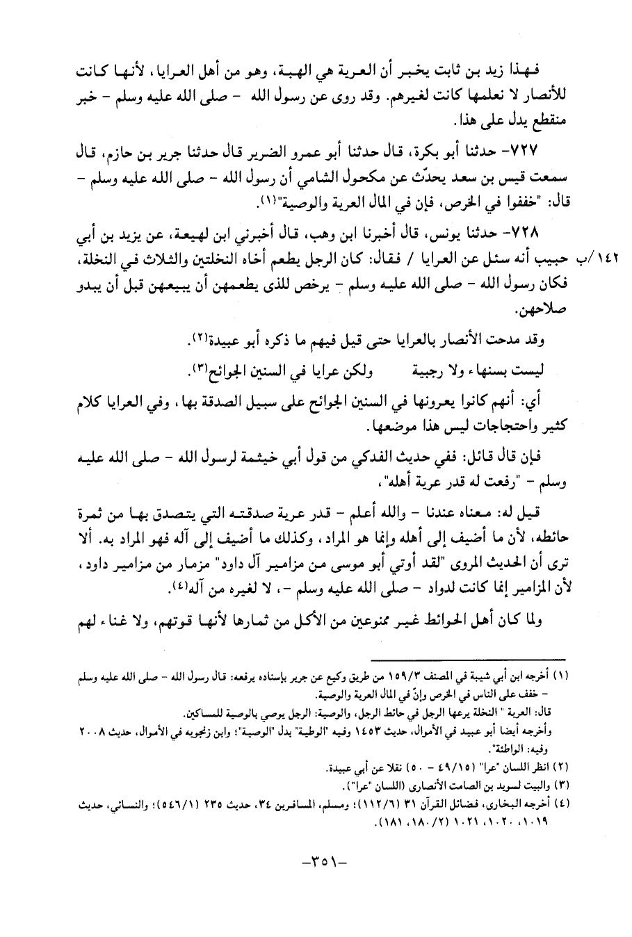 728 - حَدَّثَنَا يُونُسُ، قَالَ: أَخْبَرَنَا ابْنُ وَهْبٍ، قَالَ: أَخْبَرَنِي ابْنُ لَهِيعَةَ، عَنْ يَزِيدَ بْنِ أَبِي حَبِيبٍ أَنَّهُ سُئِلَ عَنِ الْعَرَايَا، فَقَالَ: كَانَ الرَّجُلُ يُطْعِمُ أَخَاهُ النَّخْلَتَيْنِ وَالثَّلاثَ فِي النَّخْلَةِ، فَكَانَ رَسُولُ اللهِ صَلَّى اللَّهُ عَلَيْهِ وَسَلَّمَ " يُرَخِّصُ لِلَّذِي يُطْعِمُهُنَّ أَنْ يَبِيعَهُنَّ قَبْلَ أَنْ يَبْدُوَ صَلاحُهُنَّ " وَقَدْ مُدِحَتِ الأَنْصَارُ بِالْعَرَايَا، حَتَّى قِيلَ فِيهِمْ مَا ذَكَرَهُ أَبُو عُبَيْدَةَ وَلَيْسَتْ بِسَنْهَاءٍ وَلا رَجَبِيَّةٍ وَلَكِنْ عَرَايَا فِي السِّنِينَ الْجَوَائِحِ أَي: أَنهم كَانُوا يعرونها فِي السنين الجوائح عَلَى سَبِيل الصَّدَقَة بِهَا، وفِي الْعَرَايَا كَلَام كثير واحتجاجات لَيْسَ هَذَا مَوْضِعَهَا فَإِن قَالَ قَائِل: ففِي حَدِيث الفدكي من قَول أَبِي خَيْثَمَة لرَسُول اللهِ صَلَّى اللَّهُ عَلَيْهِ وَسَلَّمَ " رفعت لَهُ قَدْر عرية أَهله " قيل لَهُ: مَعْنَاهُ عِنْدَنَا وَالله أعلم، قَدْر عرية صدقته الَّتِي يتَصَدَّق بِهَا من ثَمَرَة حَائِطه، لِأَن مَا أضيف إِلَى أَهله إنمَا هُوَ المُرَاد، وكذَلِكَ مَا أضيف إِلَى آله فَهُوَ المُرَاد بِهِ، أَلا ترى أَن الحَدِيث الْمَرْوِيّ، " لقَدْ أُوتِيَ أَبُو مُوسَى من مَزَامِير آل دَاوُد " مزمَار من مَزَامِير دَاوُد، لِأَن المزامير إنمَا كَانَت لداود صَلَّى اللَّهُ عَلَيْهِ وَسَلَّمَ، لَا لغيره من آله ولمَّا كَانَ أهل الحوائط غير ممنوعين من الْأكل من ثمَارها لِأَنَّهَا قوتهم، وَلَا غناء لَهُم