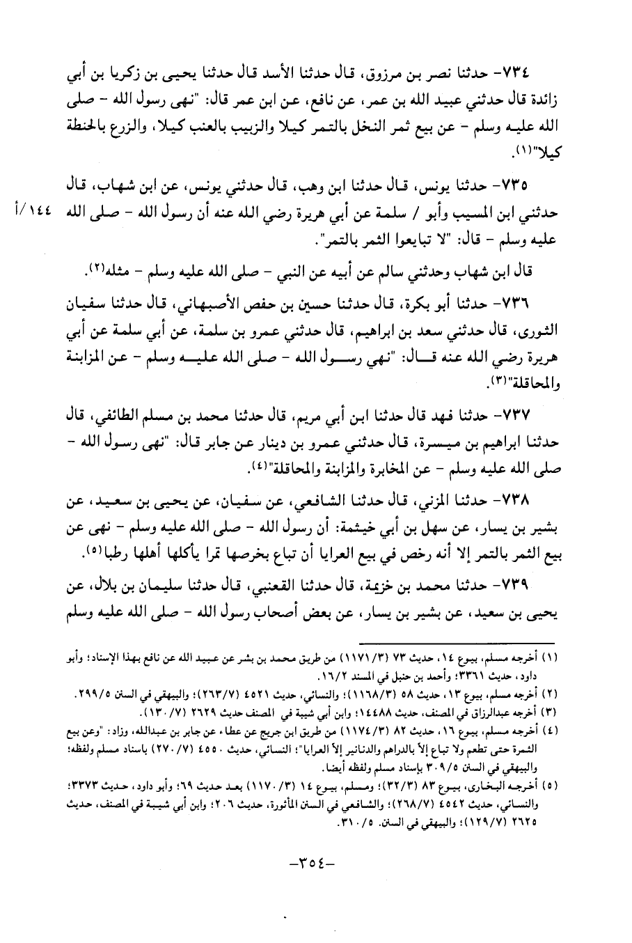 735 - حَدَّثَنَا يُونُسُ، قَالَ: حَدَّثَنَا ابْنُ وَهْبٍ، قَالَ: حَدَّثَنِي يُونُسُ، عَنِ ابْنِ شِهَابٍ، قَالَ: حَدَّثَنِي ابْنُ الْمُسَيِّبِ، وَأَبُو سَلَمَةَ، عَنْ أَبِي هُرَيْرَةَ رَضِيَ اللهُ عَنْهُ، أَنَّ رَسُولَ اللهِ صَلَّى اللَّهُ عَلَيْهِ وَسَلَّمَ، قَالَ: " لَا تَبَايَعُوا الثَّمَرَ بِالتَّمْرِ " قَالَ ابْنُ شِهَابٍ وَحَدَّثَنِي سَالِمٌ، عَنْ أَبِيهِ، عَنِ النَّبِيِّ صَلَّى اللَّهُ عَلَيْهِ وَسَلَّمَ مِثْلَهُ