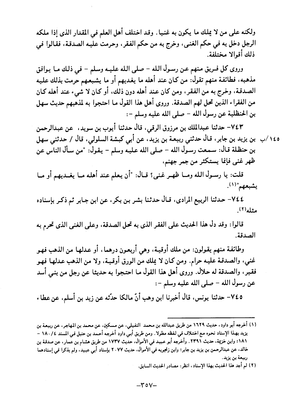 744 - حَدَّثَنَا الرَّبِيعُ الْمُرَادِيُّ، قَالَ: حَدَّثَنَا بِشْرُ بْنُ بَكْرٍ، عَنِ ابْنِ جَابِرٍ، ثُمَّ ذَكَرَ بِإِسْنَادِهِ مِثْلَهُ قَالُوا: وقَدْ دلّ هَذَا الحَدِيث عَلَى الْفقر الَّذِي بِهِ تحل الصَّدَقَة، وعَلَى الْغنى الَّذِي تحرم بِهِ الصَّدَقَة وَطَائِفَة مِنْهُمْ يَقُولُونَ: من ملك أُوقِيَّة، وَهِيَ أَرْبَعُونَ درهمَا، أَو عدلها من الذَّهَب فَهُوَ غَنِي، وَالصَّدَََقَة عَلَيْهِ حرَام وَمن كَانَ لَا يملك من الْوَرق أُوقِيَّة، وَلَا من الذَّهَب عدلها فَهُوَ فَقير، وَالصَّدَََقَة لَهُ حَلَال، وروى أهل هَذَا القَوْل مَا احْتَجُّوا بِهِ حَدِيثا عَنْ رجل من بني أَسد عَنْ رَسُول اللهِ صَلَّى اللَّهُ عَلَيْهِ وَسَلَّمَ: