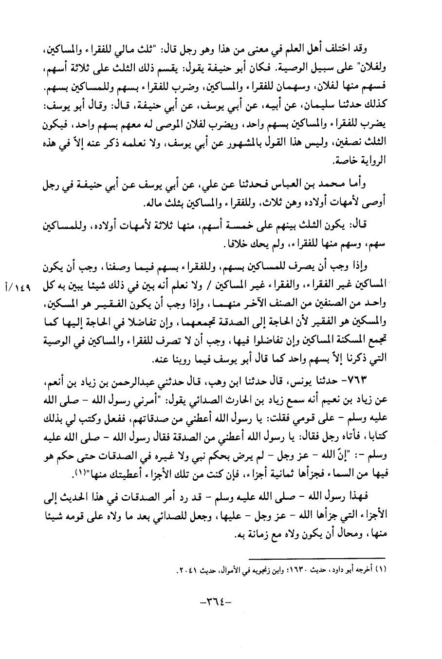 وقَدِ اخْتلف أهل الْعلم فِي معنى من هَذَا وَهُوَ رجل، قَالَ: ثلث مَالي للْفُقَرَاء وَالْمَسَاكِين، وَلفُلَان، عَلَى سَبِيل الْوَصِيَّة، فكَانَ أَبُو حَنِيفَةَ، يَقُولُ: يقسم ذَلِكَ الثُّلُث عَلَى ثَلَاثَة أسْهم، فسهم مِنْهَا لفُلَان، وسهمَان للْفُقَرَاء وَالْمَسَاكِين، وَضرب للْفُقَرَاء بِسَهْم وللمساكين بِسَهْم، كَذَلِكَ حَدَّثَنَا سليمَان، عَنْ أَبِيهِ، عَنْ أَبِي يُوسُفَ، عَنْ أَبِي حَنِيفَةَ، قَالَ: وقَالَ أَبُو يُوسُف: يضْرب للْفُقَرَاء وَالْمَسَاكِين بِسَهْم وَاحِد، وَيضْرب لفُلَان الْمُوصي لَهُ مَعَهم بِسَهْم وَاحِد، فَيكون الثُّلُث نصفَيْن، ولَيْسَ هَذَا القَوْل بالمشهور عَنْ أَبِي يُوسُفَ، وَلَا نعلمهُ ذكر عَنهُ إِلَّا فِي هَذِهِ الرِّوَايَة خَاصَّة وأمَّا مُحَمَّد بن الْعَبَّاس فحَدَّثَنَا، عَنْ عَليّ، عَنْ أَبِي يُوسُفَ، عَنْ أَبِي حَنِيفَةَ، فِي " رجل أوصى لأمهات أَوْلَاده وَهن ثَلَاث، وللفقراء وَالْمَسَاكِين بِثلث مَاله، قَالَ: يكون الثُّلُث بَينهم عَلَى خَمْسَة أسْهم، مِنْهَا ثَلَاثَة لأمهات أَوْلَاده، وللمساكين سهم، وَسَهْم مِنْهَا للْفُقَرَاء، وَلم يحك خلاف " وإِذَا وَجب أَن يصرف للْمَسَاكِين بِسَهْم، وللفقراء بِسَهْم فِيمَا وَصفنَا، وَجب أَن يكون الْمَسَاكِين غير الْفُقَرَاء، والفقراء