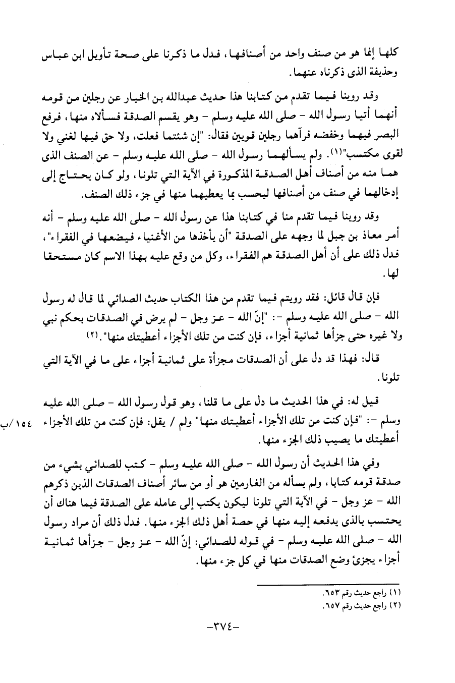 وَلم يقل: فَإِن كنت من تِلْكَ الْأَجْزَاء أَعطيتك مَا يُصِيب ذَلِكَ الْجُزْء مِنْهَا وفِي هَذَا الحَدِيث أَن رَسُول اللهِ صَلَّى اللَّهُ عَلَيْهِ وَسَلَّمَ كتب للصدائي بِشَيْء من صَدَقَة قومه كتابا، وَلم يسْأَله من الغارمين هُوَ أَو من سَائِر أَصْنَاف الصَّدقَات الَّذين ذكرهم الله عَزَّ وَجَلَّ فِي الْآيَة الَّتِي تلونا ليَكُون يكْتب إِلَى عَامله عَلَى الصَّدَقَة فِيمَا هُنَاكَ أَن يحْتَسب بِالَّذِي يَدْفَعهُ إِلَيْهِ مِنْهَا فِي حِصَّة أهل ذَلِكَ الْجُزْء مِنْهَا، فَدلَّ ذَلِكَ أَن مُرَاد رَسُول اللهِ صَلَّى اللَّهُ عَلَيْهِ وَسَلَّمَ فِي قَوْله للصدائي: إِن الله عَزَّ وَجَلَّ جزأها ثمَانية أَجزَاء يُجزئ وضع الصَّدقَات مِنْهَا فِي كل جُزْء مِنْهَا