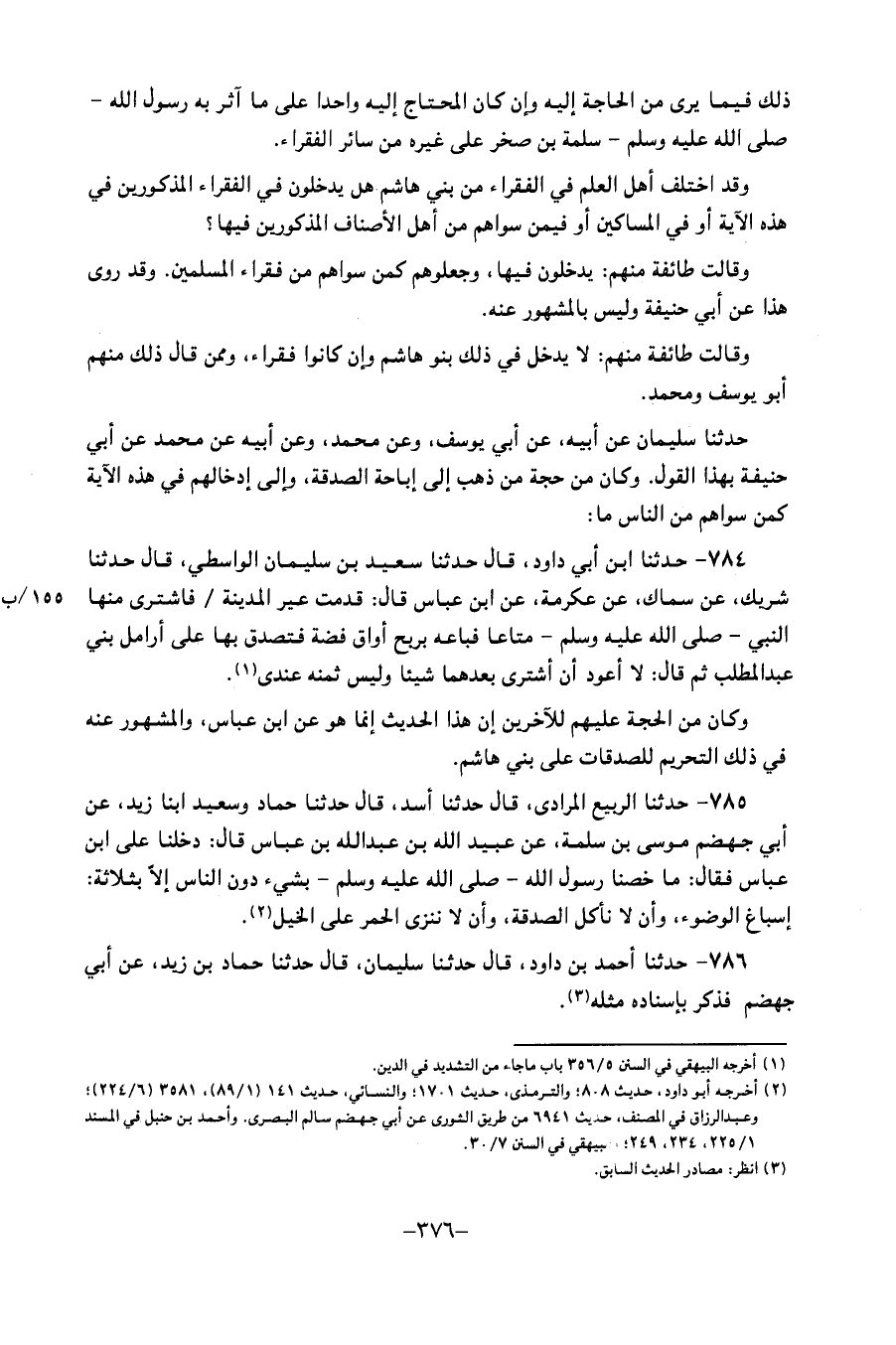 784 - حَدَّثَنَا ابْنُ أَبِي دَاوُدَ، قَالَ: حَدَّثَنَا سَعِيدُ بْنُ سُلَيْمَانَ الْوَاسِطِيُّ، قَالَ: حَدَّثَنَا شَرِيكٌ، عَنْ سِمَاكٍ، عَنْ عِكْرِمَةَ، عَنِ ابْنِ عَبَّاسٍ، قَالَ: قَدِمَتْ عِيرٌ الْمَدِينَةَ، فَاشْتَرَى مِنْهَا النَّبِيُّ صَلَّى اللَّهُ عَلَيْهِ وَسَلَّمَ مَتَاعًا فَبَاعَهُ بِرِبْحِ أَوَاقٍ فِضَّةً، فَتَصَدَّقَ بِهَا عَلَى أَرَامِلِ بَنِي عَبْدِ الْمُطَّلِبِ، ثُمَّ قَالَ: " لَا أَعُودُ أَنْ أَشْتَرِيَ بَعْدَهَا شَيْئًا وَلَيْسَ ثَمَنُهُ عِنْدِي " وكَانَ من الْحجَّة عَلَيْهِم للآخرين أَن هَذَا الحَدِيث إنمَا هُوَ عَنِ ابْنِ عَبَّاس، وَالْمَشْهُور عَنهُ فِي ذَلِكَ التَّحْرِيم للصدقات عَلَى بني هَاشم