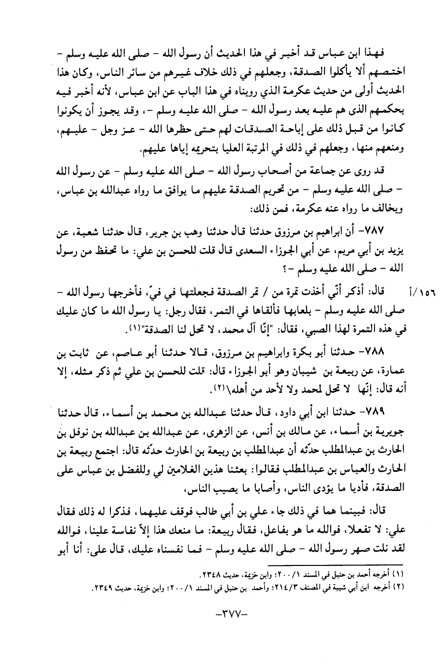 فَهَذَا ابْن عَبَّاس قَدْ أخبر فِي هَذَا الحَدِيث أَن رَسُول اللهِ صَلَّى اللَّهُ عَلَيْهِ وَسَلَّمَ اختصهم أَلا يَأْكُلُوا الصَّدَقَة، وجعلهم فِي ذَلِكَ خلاف غَيرهم من سَائِر النَّاس، وكَانَ هَذَا الحَدِيث أولى من حَدِيث عِكْرِمَة الَّذِي روينَاهُ فِي هَذَا الْبَاب عَنِ ابْنِ عَبَّاس لِأَنَّهُ أخبر فِيه بحكمهم الَّذِي هم عَلَيْهِ بعد رَسُول اللهِ صَلَّى اللَّهُ عَلَيْهِ وَسَلَّمَ، وقَدْ يجوز أَن يَكُونُوا كَانُوا من قبل ذَلِكَ عَلَى إِبَاحَة الصَّدقَات لَهُم حَتَّى حظرها الله عَزَّ وَجَلَّ عَلَيْهِم، ومنعهم مِنْهَا، وجعلهم فِي ذَلِكَ فِي الْمرتبَة الْعليا بِتَحْرِيمِهِ إِيَّاهَا عَلَيْهِم قَدْ رُوِيَ عَنْ جمَاعة من أَصْحَاب رَسُول اللهِ صَلَّى اللَّهُ عَلَيْهِ وَسَلَّمَ، عَنْ رَسُول اللهِ صَلَّى اللَّهُ عَلَيْهِ وَسَلَّمَ، من تَحْرِيم الصَّدَقَة عَلَيْهِم مَا يُوَافق مَا رَوَاهُ عبد الله بن عَبَّاس، وَيُخَالف مَا رَوَاهُ عَنهُ عِكْرِمَة، فَمن ذَلِكَ