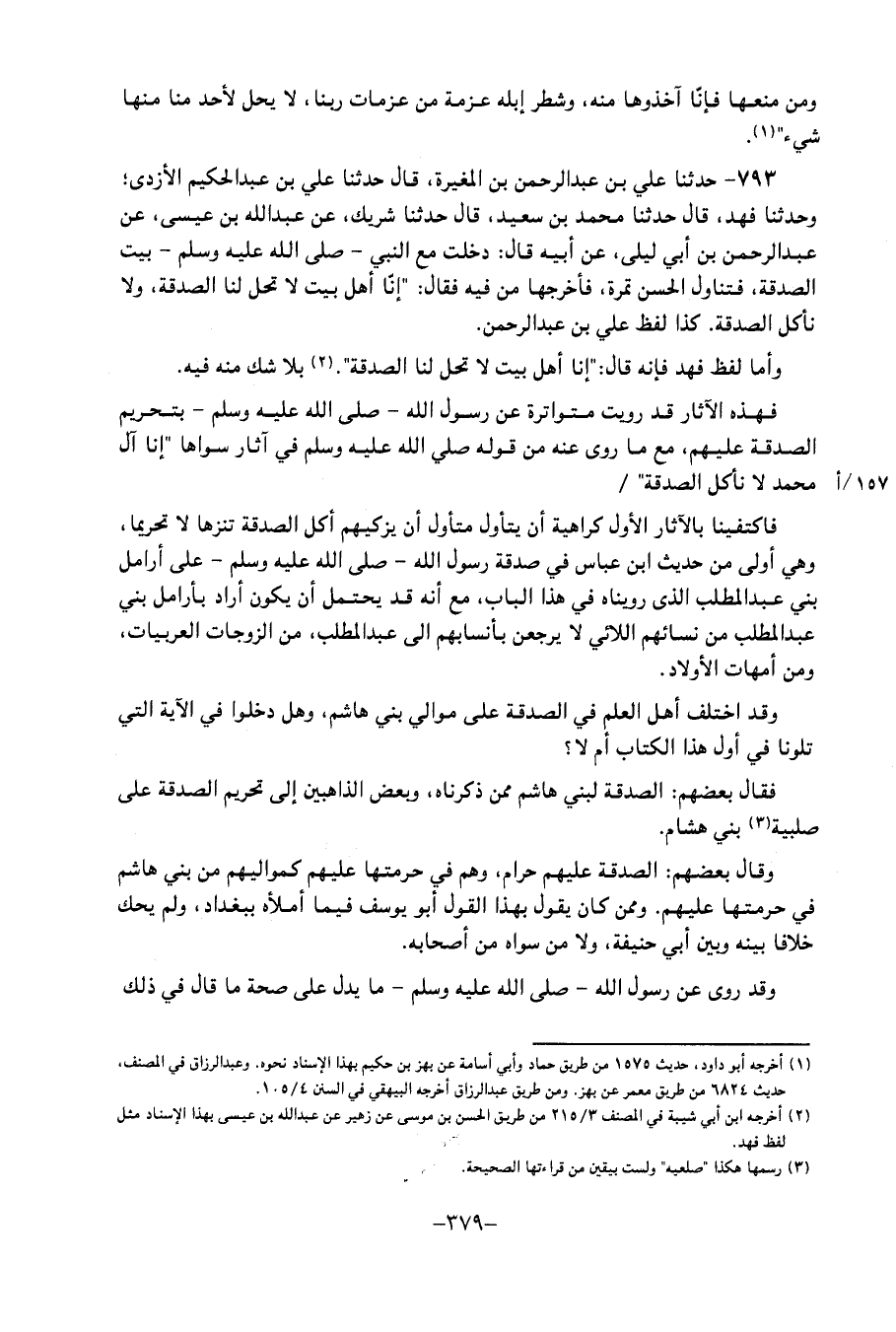 793 - حَدَّثَنَا عَلِيُّ بْنُ عَبْدِ الرَّحْمَنِ بْنِ الْمُغِيرَةِ، قَالَ: حَدَّثَنَا عَلِيُّ بْنُ عَبْدِ الْحَكِيمِ الأَزْدِيُّ، وَحَدَّثَنَا فَهْدٌ، قَالَ: حَدَّثَنَا مُحَمَّدُ بْنُ سَعِيدٍ، قَالَ: حَدَّثَنَا شَرِيكٌ، عَنْ عَبْدِ اللهِ بْنِ عِيسَى، عَنْ عَبْدِ الرَّحْمَنِ بْنِ أَبِي لَيْلَى، عَنْ أَبِيهِ، قَالَ: دَخَلْتُ مَعَ النَّبِيِّ صَلَّى اللَّهُ عَلَيْهِ وَسَلَّمَ بَيْتَ الصَّدَقَةِ، فَتَنَاوَلَ الْحَسَنُ تَمْرَةً، فَأَخْرَجَهَا مِنْ فِيهِ، فَقَالَ: " إِنَّا أَهْلُ بَيْتٍ لَا تَحِلُّ لَنَا الصَّدَقَةُ، وَلا نَأْكُلُ الصَّدَقَةَ " كَذَا لفظ عَليّ بن عبد الرَّحْمَن وَأما لفظ فَهد، فَإِنَّهُ قَالَ: " إِنَّا أهل بَيت لَا تحل لنا الصَّدَقَة " بِلَا شكّ مِنْهُ فِيهِ فَهَذِهِ الْآثَار قد رويت متواترة عَن رَسُول الله صلي الله عَلَيْهِ وَسلم بِتَحْرِيم الصَّدَقَة عَلَيْهِم، مَعَ مَا رُوِيَ عَنهُ من قَوْله صلي الله عَلَيْهِ وَسلم فِي آثَار سواهَا " إِنَّا آل مُحَمَّد لَا نَأْكُل الصَّدَقَة " فاكتفينا بالآثار الأُوَلِ كَرَاهِيَة أَن يتَأَوَّل متأول أَن يزكيهم أكل الصَّدَقَة تنزها لَا تَحْرِيمًا، وَهِيَ أولى من حَدِيث ابْن عَبَّاس فِي صَدَقَة رَسُول اللهِ صَلَّى اللَّهُ عَلَيْهِ وَسَلَّمَ عَلَى أرامل بني عبد الْمطلب الَّذِي روينَاهُ فِي هَذَا الْبَاب، مَعَ أَنه قَدْ يحْتَمل أَن يكون أَرَادَ بأرامل بني عبد الْمطلب من نِسَائِهِم اللائي لَا يرجعن بأنسابهم إِلَى عبد الْمطلب، من الزَّوْجَات العربيات، وَمن أُمَّهَات الْأَوْلَاد وقَدِ اخْتلف أهل الْعلم فِي الصَّدَقَة عَلَى موَالِي بني هَاشم، وَهل دخلُوا فِي الْآيَة الَّتِي تلونا فِي أول هَذَا الْكتاب أم لَا؟ فقَالَ بَعضهم: الصَّدَقَة لبني هَاشم مِمَّنْ ذَكَرْنَاهُ، وَبَعض الذاهبين إِلَى