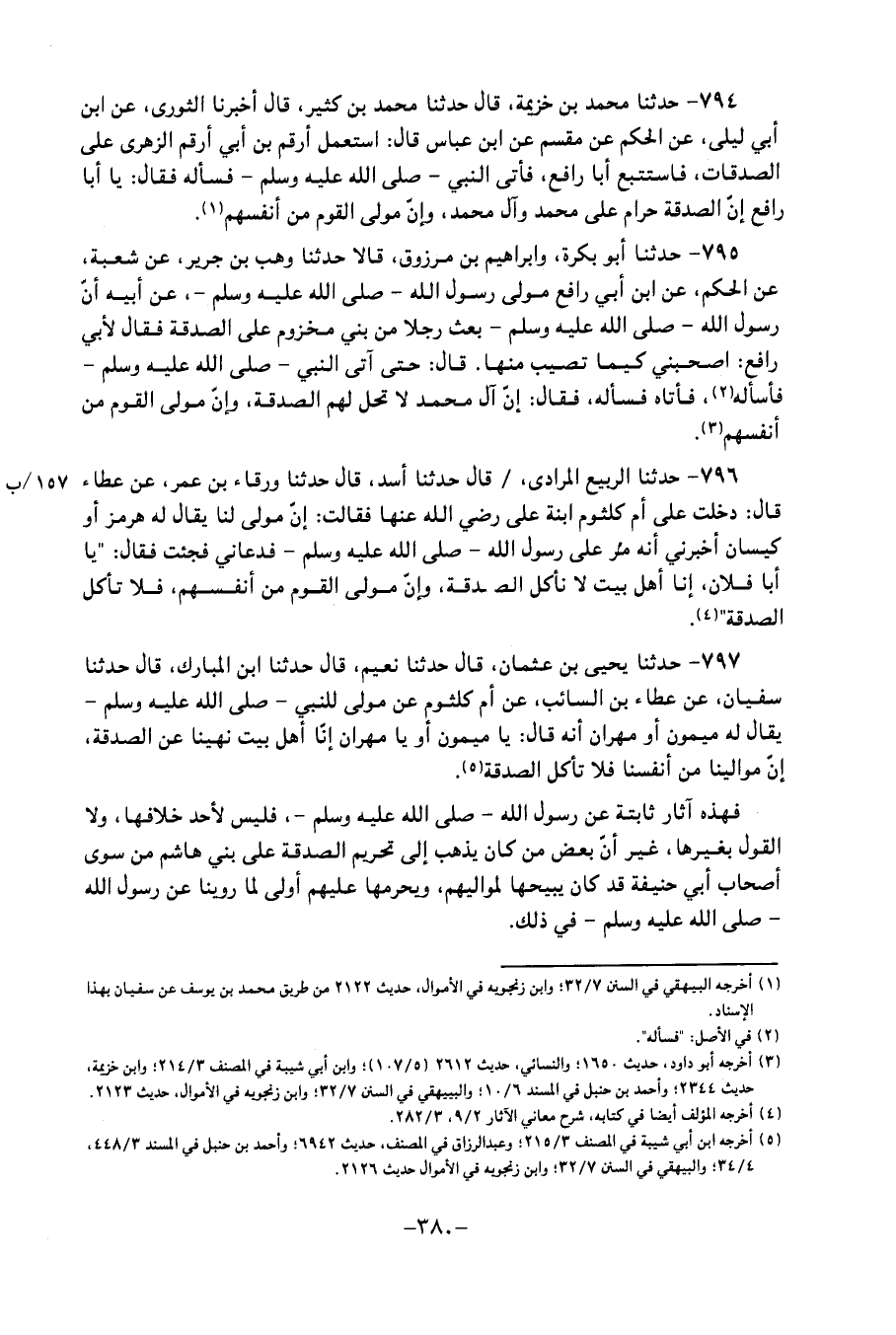 797 - حَدَّثَنَا يَحْيَى بْنُ عُثْمَانَ، قَالَ: حَدَّثَنَا نُعَيْمٌ، قَالَ: حَدَّثَنَا ابْنُ الْمُبَارَكِ، قَالَ: حَدَّثَنَا سُفْيَانُ، عَنْ عَطَاءِ بْنِ السَّائِبِ، عَنْ أُمِّ كُلْثُومٍ، عَنْ مَوْلًى لِلنَّبِيِّ صَلَّى اللَّهُ عَلَيْهِ وَسَلَّمَ يُقَالُ لَهُ: مَيْمُونٌ، أَوْ مِهْرَانُ، أَنَّهُ قَالَ: " يَا مَيْمُونُ، أَوْ يَا مِهْرَانُ، إِنَّا أَهْل بَيْت نُهِينَا عَنِ الصَّدَقَةِ، إِنَّ مَوَالِيَنَا مِنْ أَنْفُسِنَا فَلا تَأْكُلِ الصَّدَقَةَ " فَهَذِهِ آثَار ثَابِتَة عَن رَسُول اللهِ صَلَّى اللَّهُ عَلَيْهِ وَسَلَّمَ، فلَيْسَ لأحد خلَافهَا، وَلَا القَوْل بغَيْرهَا، غير أَن بعض من كَانَ يذهب إِلَى تَحْرِيم الصَّدَقَة عَلَى بني هَاشم من سوى أَصْحَاب أَبِي حَنِيفَةَ قَدْ كَانَ يبيحها لمواليهم، ويحرمها عَلَيْهِم أولى لمَا روينَا عَنْ رَسُول اللهِ صَلَّى اللَّهُ عَلَيْهِ وَسَلَّمَ فِي ذَلِكَ