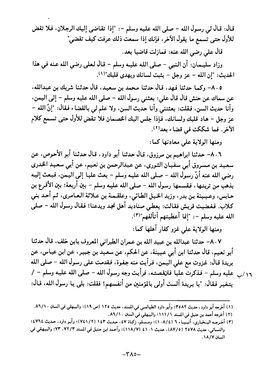 805 - وَكَمَا حَدَّثَنَا فَهْدٌ، قَالَ: حَدَّثَنَا مُحَمَّدُ بْنُ سَعِيدٍ، قَالَ: حَدَّثَنَا شَرِيكُ بْنُ عَبْدِ اللهِ، عَنْ سِمَاكٍ، عَنْ حَنَشٍ، قَالَ: قَالَ عَلِيٌّ: بَعَثَنِي رَسُولُ اللهِ صَلَّى اللَّهُ عَلَيْهِ وَسَلَّمَ إِلَى الْيَمَنِ، وَأَنَا حَدِيثُ السِّنِّ، فَقُلْتُ: بَعَثْتَنِي وَأَنَا حَدِيثُ السِّنِّ، وَلا عِلْمَ لِي بِالْقَضَاءِ، فَقَالَ: " إِنَّ اللهَ عَزَّ وَجَلَّ هَادٍ قَلْبَكَ وَلِسَانَكَ، فَإِذَا جَلَسَ إِلَيْكَ الْخَصْمَانِ فَلا تَقْضِ لِلأَوَّلِ حَتَّى تَسْمَعَ كَلامَ الآخَرِ، فَمَا شَكَكْتُ فِي قَضَاءٍ بَعْدُ " وَمِنْهَا الْولَايَة عَليّ معادنها كمَا
