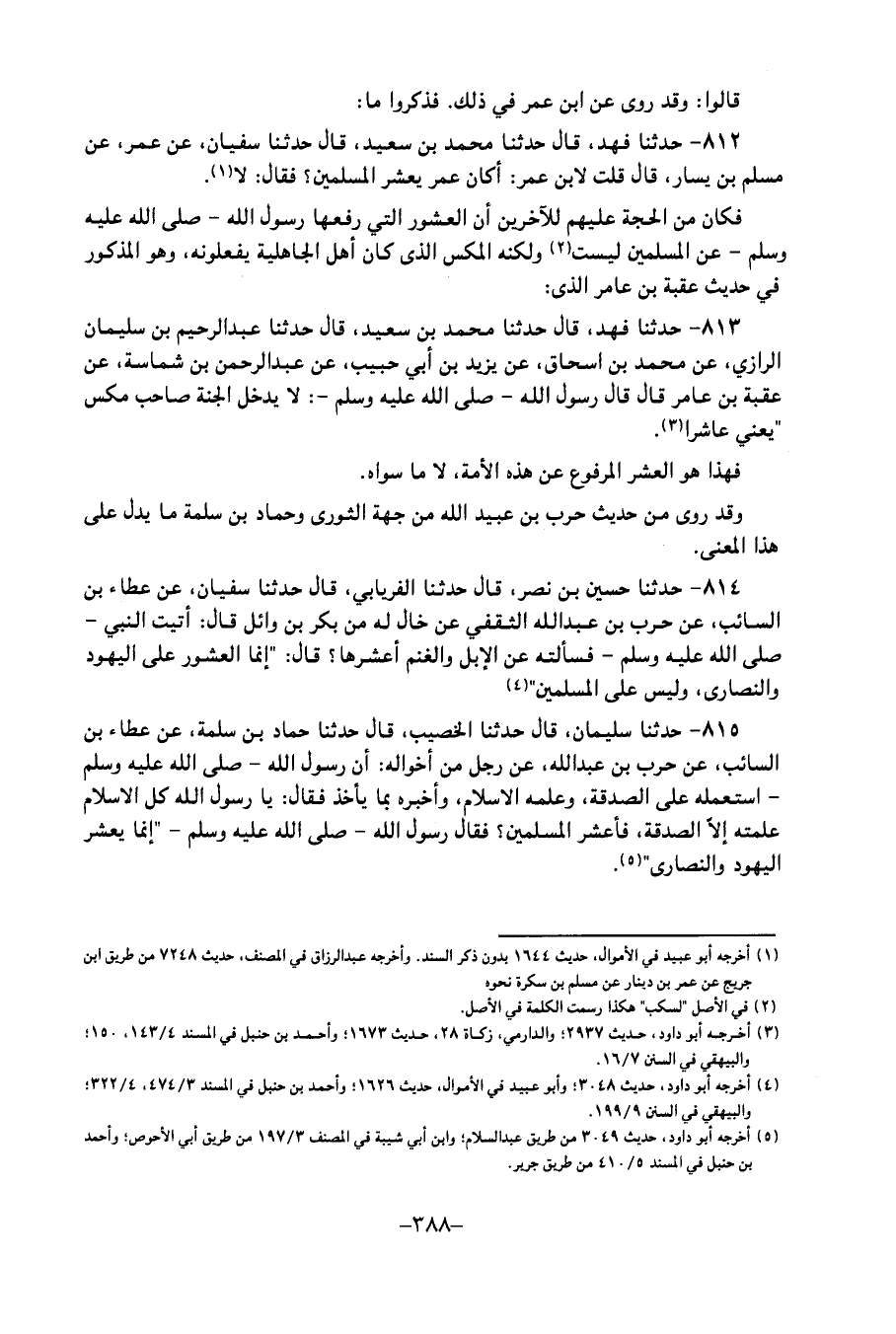 812 - حَدَّثَنَا فَهْدٌ، قَالَ: حَدَّثَنَا مُحَمَّدُ بْنُ سَعِيدٍ، قَالَ: حَدَّثَنَا سُفْيَانُ، عَنْ عُمَرَ، عَنْ مُسْلِمِ بْنِ يَسَارٍ، قَالَ: قُلْتُ لابْنِ عُمَرَ: " أَكَانَ عُمَرُ يَعْشِرُ الْمُسْلِمِينَ؟ فَقَالَ: لَا " فكَانَ من الْحجَّة عَلَيْهِم للآخرين أَن العشور الَّتِي رَفعهَا رَسُول اللهِ صَلَّى اللَّهُ عَلَيْهِ وَسَلَّمَ عَنِ الْمُسْلِمِينَ لَيْسَت، وَلكنه المكس الَّذِي كَانَ أهل الْجَاهِلِيَّة يَفْعَلُونَهُ، وَهُوَ الْمَذْكُور فِي حَدِيث عقبَة بن عَامر الَّذِي
