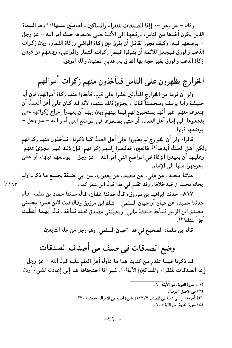وقَالَ عَزَّ وَجَلَّ: {إِنَّمَا الصَّدَقَاتُ لِلْفُقَرَاءِ وَالْمَسَاكِينِ وَالْعَامِلِينَ عَلَيْهَا} وهم السعاة الَّذين يكون أَخذهَا من النَّاس، ورفعها إِلَى الْأَئِمَّة حَتَّى يضعوها حَيْثُ أَمر الله عَزَّ وَجَلَّ بوضعها فِيه وَكَيف يجوز لقَائِل أَن يفرق بَيْنَ زَكَاة الْمَوَاشِي وَزَكَاة الثمَار، وبثين زكوات الذَّهَب وَالْوَرق، فَيجْعَل للأئمة أَن يتولوا قبض زكوات الثمَار والمواشي، ويمنعهم من قبض زَكَاة الذَّهَب وَالْوَرق بِغَيْر حجَّة بِهَا الْفرق بَيْنَ هذَيْن الْمَعْنيين وَالله الْمُوفق الْخَوَارِج يظهرون عَلَى النَّاس فَيَأْخُذُونَ مِنْهُمْ زكوات أَمْوَالهم وَلَو أَن قومَا من الْخَوَارِج المتأولين غلبوا عَلَى قوم، فَأخذُوا مِنْهُمْ زَكَاة أَمْوَالهم، فَإِن أَبَا حَنِيفَةَ، وَأَبا يُوسُف، ومحمدا، قَالُوا: يُجزئ ذَلِكَ عَنْهُم، لِأَنَّهُ قَدْ كَانَ عَلَى أهل الْعدْل أَن يمنعوهم مِنْهُمْ، غير أَنهم يستحبون لَهُم فِيمَا بَينهم وَبَين رَبهم أَن يُعِيدُوا إِخْرَاج زكواتهم حَتَّى يدفعوها إِلَى إمَام أهل الْعدْل، أَو حَتَّى يضعوها فِي الْمَوَاضِع الَّتِي أَمر الله عَزَّ وَجَلَّ بوضعها فِيهَا قَالُوا: وَلَو أَن الْخَوَارِج لم يظهروا عَلَى أهل الْعدْل كَمَا ذكرنَا، فَيَأْخُذُونَ مِنْهُمْ زكواتهم وَلَكِن أهل الْعدْل أتوهم طائعين، فدفعوا إِلَيْهِم زكواتهم، فَإِن ذَلِكَ غير مجزئ عَنْهُم، وعَلَيْهِم أَن يُعِيدُوا الزَّكَاة فِي الْمَوَاضِع الَّتِي أَمر الله عَزَّ وَجَلَّ بوضعها فِيهَا، أَو حَتَّى يخرجوها مِنْهَا إِلَى الإمَام حَدَّثَنَا مُحَمَّد، عَنْ عَليّ، عَنْ مُحَمَّد، عَنْ