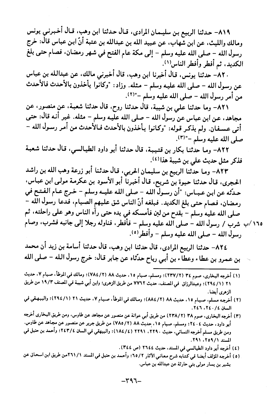 819 - حَدَّثَنَا الرَّبِيعُ بْنُ سُلَيْمَانَ الْمُرَادِيُّ، قَالَ: حَدَّثَنَا ابْنُ وَهْبٍ، قَالَ: أَخْبَرَنِي يُونُسُ، وَمَالِكٌ، وَاللَّيْثُ، عَنِ ابْنِ شِهَابٍ، عَنْ عُبَيْدِ اللهِ بْنِ عَبْدِ اللهِ بْنِ عُتْبَةَ، أَنَّ ابْنَ عَبَّاسٍ، قَالَ: خَرَجَ رَسُولُ اللهِ صَلَّى اللَّهُ عَلَيْهِ وَسَلَّمَ إِلَى مَكَّةَ عَامَ الْفَتْحِ فِي شَهْرِ رَمَضَانَ، " فَصَامَ حَتَّى بَلَغَ الْكَدِيدَ، ثُمَّ أَفْطَرَ وَأَفْطَرَ النَّاسُ "