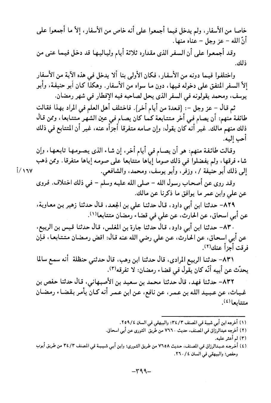 خَاصّا من الْأَسْفَار، وَلم يدْخل فِيمَا أَجمعُوا عَلَى أَنه خَاص من الْأَسْفَار، إِلَّا مَا أَجمعُوا عَلَى أَن الله عَزَّ وَجَلَّ عناه مِنْهَا وقَدْ أَجمعُوا عَلَى أَن السّفر الَّذِي مِقْدَاره ثَلَاثَة أَيَّام ولياليها قَدْ دخل فِيمَا عني من ذَلِكَ وَاخْتلفُوا فِيمَا دونه من الْأَسْفَار، فكَانَ الأولى بِنَا أَلا يدْخل فِي هَذِهِ الْآيَة من الْأَسْفَار إِلَّا السّفر الْمُتَّفق عَلَى دُخُوله فِيهَا، دون مَا سواهُ من الْأَسْفَار، وَهَكَذَا كَانَ أَبُو حَنِيفَةَ وَأَبُو يُوسُفَ، وَمُحَمّد، يَقُولُونَهُ فِي السّفر الَّذِي يحل لصَاحبه فِيه الْإِفْطَار فِي شهر رَمَضَان ثُمَّ قَالَ عَزَّ وَجَلَّ: {فَعِدَّةٌ مِنْ أَيَّامٍ أُخَرَ} ، فَاخْتلف أهل الْعلم فِي المُرَاد بِهَذَا، فقَالَت طَائِفَة مِنْهُمْ: أَن يصام فِي أُخَرَ مُتَتَابِعَةٍ كمَا كَانَ يصام فِي عين الشَّهْر مُتَتَابِعًا، وَمِمَّنْ قَالَ ذَلِكَ مِنْهُمْ مَالك، غير أَنَّهُ كَانَ يَقُولُ: وَإِن صَامَهُ مُتَفَرقًا أَجزَأَهُ عَنهُ، غير أَن المتتابع فِي ذَلِكَ أحب إِلَيْهِ وقَالَت طَائِفَة مِنْهُمْ: هُوَ أَن يصام فِي أَيَّام أخر، إِن شَاءَ الَّذِي يصومها تابعها، وَإِن شَاءَ فرقها، وَلم يفضلوا