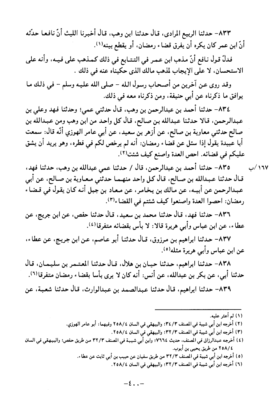 833- حَدَّثَنَا الرَّبِيعُ الْمُرَادِيُّ، قَالَ: حَدَّثَنَا ابْنُ وَهْبٍ قَالَ: أَخْبَرَنَا اللَّيْثُ، أَنَّ نَافِعًا حَدَّثَهُ، أَنَّ ابْنَ عُمَرَ كَانَ " يَكْرَهُ أَنْ يُفَرَّقَ قَضَاءُ رَمَضَانَ، أَوْ يُقَطَّعَ بَيْنَهُ " فَدلَّ قَول نَافِع أَن مَذْهَب ابْن عمر فِي التَّتَابُع فِي ذَلِكَ كمذهب عَليّ فِيه، وَأَنه عَلَى الِاسْتِحْسَان، لَا عَلَى الْإِيجَاب لمَذْهَب مَالك الَّذِي حكيناه عَنهُ فِي ذَلِكَ وقَدْ رُوِيَ عَنْ آخَرين من أَصْحَاب رَسُول اللهِ صَلَّى اللَّهُ عَلَيْهِ وَسَلَّمَ فِي ذَلِكَ مَا يُوَافق مَا ذَكَرْنَاهُ عَنْ أَبِي حَنِيفَةَ، وَمن ذَكَرْنَاهُ مَعَه فِي ذَلِكَ