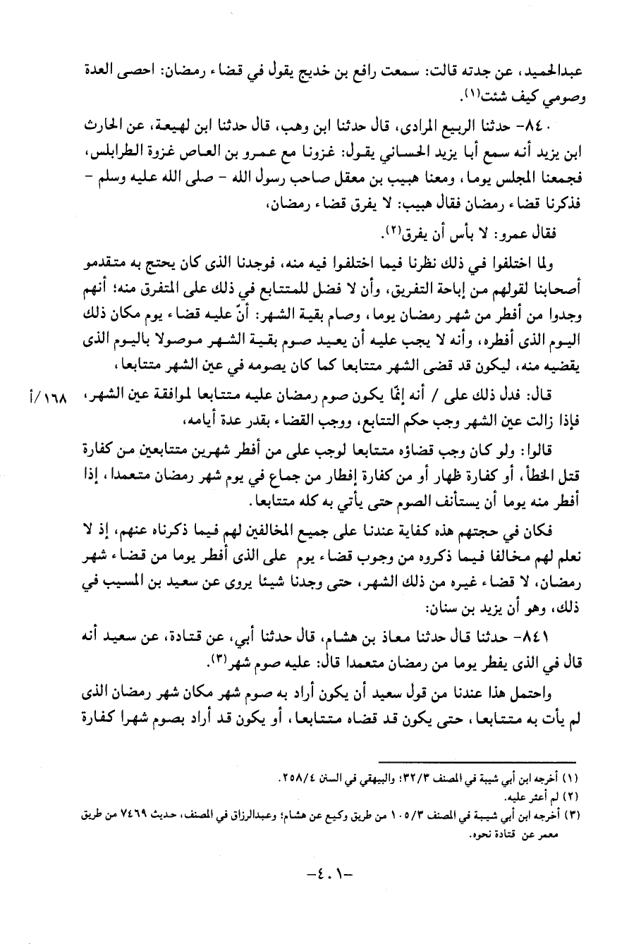 840 - حَدَّثَنَا الرَّبِيعُ الْمُرَادِيُّ، قَالَ: حَدَّثَنَا ابْنُ وَهْبٍ، قَالَ: حَدَّثَنَا ابْنُ لَهِيعَةَ، عَنِ الْحَارِثِ بْنِ يَزِيدَ، أَنَّهُ سَمِعَ أَبَا يَزِيدَ الْحَسَّانِيَّ، يَقُولُ: غَزَوْنَا مَعَ عَمْرِو بْنِ الْعَاصِ غَزْوَةَ الطَّرَابُلْسِ، فَجَمَعَنَا الْمَجْلِسُ يَوْمًا، وَمَعَنَا هُبَيْبُ بْنُ مُغَفَّلٍ صَاحِبُ رَسُولِ اللهِ صَلَّى اللَّهُ عَلَيْهِ وَسَلَّمَ، فَذَكَرْنَا قَضَاءَ رَمَضَانَ، فَقَالَ هُبَيْبٌ: " لَا يُفَرَّقُ قَضَاءُ رَمَضَانَ، فَقَالَ عَمْرٌو: لَا بَأْسَ أَنْ يُفَرَّقَ " ولمَّا اخْتلفُوا فِي ذَلِكَ نَظرنَا فِيمَا اخْتلفُوا فِيه مِنْهُ، فَوَجَدنَا الَّذِي كَانَ يحْتَج بِهِ متقَدمو أَصْحَابنَا لقَولهم من إِبَاحَة التَّفْرِيق، وَأَن لَا فضل للمتتابع فِي ذَلِكَ عَلَى المتفرق مِنْهُ أَنهم وجدوا من أفطر من شهر رَمَضَان يَوْمًا، وَصَامَ بَقِيَّة الشَّهْر: أَن عَلَيْهِ قَضَاء يَوْم مكَانَ ذَلِكَ الْيَوْم الَّذِي أفطره، وَأَنه لَا يجب عَلَيْهِ أَن يُعِيد صَوْم بَقِيَّة الشَّهْر مَوْصُولا بِالْيَوْمِ الَّذِي يَقْضِيه مِنْهُ، ليَكُون قَدْ قضى الشَّهْر مُتَتَابِعًا كمَا كَانَ يَصُومهُ فِي عين الشَّهْر مُتَتَابِعًا، قَالَ: فَدلَّ ذَلِكَ عَلَى أَنَّهُ إنمَا يكون صَوْم رَمَضَان عَلَيْهِ مُتَتَابِعًا لموافقة عين الشَّهْر، فإِذَا زَالَت عين الشَّهْر وَجب حكم التَّتَابُع، وَوَجَب الْقَضَاء بقَدْر عدَّة أَيَّامه، قَالُوا: وَلَو كَانَ وَجب قَضَاؤُهُ مُتَتَابِعًا لوَجَبَ عَلَى من أفطر شَهْرَيْن مُتَتَابعين من كَفَّارَة قتل الْخَطَأ، أَو كَفَّارَة ظِهَار، أَو من كَفَّارَة إفطار من جمَاع فِي يَوْم شهر رَمَضَان مُتَعَمدا، إِذَا أفطر مِنْهُ يَوْم أَن يسْتَأْنف الصَّوْم حَتَّى يَأْتِي بِهِ كُله مُتَتَابِعًا فكَانَ فِي حجتهم هَذِهِ كِفَايَة عِنْدَنَا عَلَى جَمِيع المخالفِين لَهُم فِيمَا ذَكَرْنَاهُ عَنْهُم، إِذْ لَا نعلم لَهُم