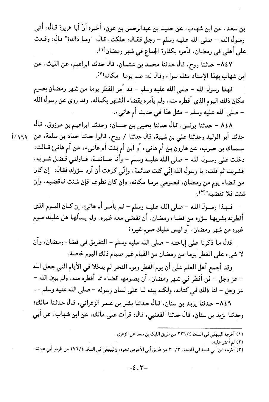 847 - حَدَّثَنَا رَوْحٌ، قَالَ: حَدَّثَنَا مُحَمَّدُ بْنُ عُثْمَانَ، قَالَ: حَدَّثَنَا إِبْرَاهِيمُ، عَنِ اللَّيْثِ، عَنِ ابْنِ شِهَابٍ بِهَذَا الإِسْنَادِ مِثْلَهُ سَوَاءً وَقَالَ لَهُ: " صُمْ يَوْمًا مَكَانَهُ " فَهَذَا رَسُول اللهِ صَلَّى اللَّهُ عَلَيْهِ وَسَلَّمَ قَدْ أَمر الْمُفطر يَوْمًا من شهر رَمَضَان بِصَوْم مكَانِ ذَلِكَ الْيَوْم الَّذِي أفطره مِنْهُ، وَلم يَأْمُرهُ بِقَضَاء الشَّهْر بكمَاله وقَدْ رُوِيَ عَنْ رَسُول اللهِ صَلَّى اللَّهُ عَلَيْهِ وَسَلَّمَ مثل هَذَا فِي حَدِيث أم هَانِئ
