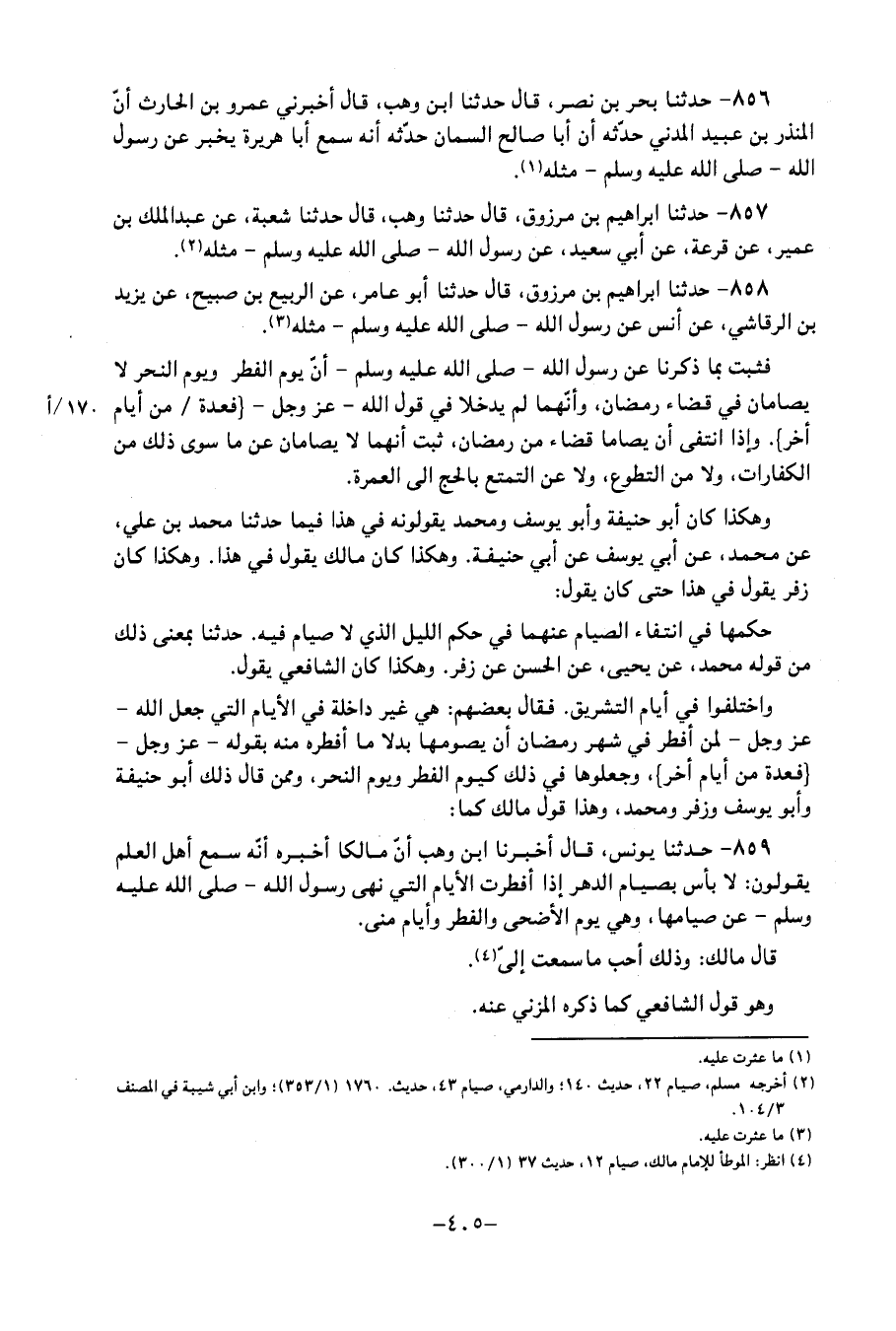859 - حَدَّثَنَا يُونُسُ، قَالَ: أَخْبَرَنَا ابْنُ وَهْبٍ، أَنَّ مَالِكًا أَخْبَرَهُ، أَنَّهُ سَمِعَ أَهْلَ الْعِلْمِ يَقُولُونَ: " لَا بَأْسَ بِصِيَامِ الدَّهْرِ إِذَا أَفْطَرْتَ الأَيَّامَ الَّتِي نَهَى رَسُولُ اللهِ صَلَّى اللَّهُ عَلَيْهِ وَسَلَّمَ عَنْ صِيَامِهَا، وَهِيَ يَوْمُ الأَضْحَى، وَالْفِطْرِ، وَأَيَّامُ مِنَى "، قَالَ مَالِكٌ: وَذَلِكَ أَحَبُّ مَا سَمِعْتُ إِلَيَّ، وَهُوَ قَوْلُ الشَّافِعِيِّ كَمَا ذَكَرَهُ الْمُزَنِيُّ عَنْهُ