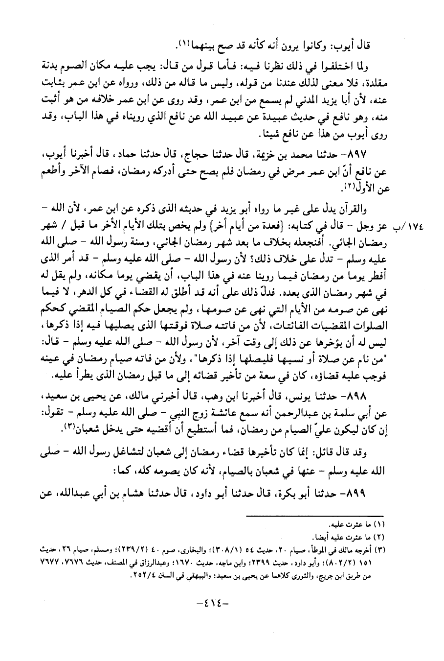 897 - حَدَّثَنَا مُحَمَّدُ بْنُ خُزَيْمَةَ، قَالَ: حَدَّثَنَا حَجَّاجٌ، قَالَ: حَدَّثَنَا حَمَّادٌ، قَالَ: أَخْبَرَنَا أَيُّوبُ، عَنْ نَافِعٍ، أَنَّ ابْنَ عُمَرَ " مَرِضَ فِي رَمَضَانَ فَلَمْ يَصِحَّ حَتَّى أَدْرَكَهُ رَمَضَانُ، فَصَامَ الآخَرَ وَأَطْعَمَ عَنِ الأَوَّلِ " وَالْقُرْآن يدل عَلَى غير مَا رَوَاهُ أَبُو يزِيد فِي حَدِيثه الَّذِي ذكره عَنِ ابْنِ عمر، لِأَن الله عَزَّ وَجَلَّ قَالَ فِي كِتَابه: {فَعِدَّةٌ مِنْ أَيَّامٍ أُخَرَ} وَلم يخص بِتِلْكَ الْأَيَّام الْأُخَر مَا قبل شهر رَمَضَان الجائي أفنجعله بِخِلَاف مَا بعد شهر رَمَضَان الجائي، وَسنة رَسُول اللهِ صَلَّى اللَّهُ عَلَيْهِ وَسَلَّمَ تدل عَلَى خلاف ذَلِكَ؟ لِأَن رَسُول اللهِ صَلَّى اللَّهُ عَلَيْهِ وَسَلَّمَ قَدْ أَمر الَّذِي أفطر يَوْمًا من رَمَضَان فِيمَا روينَا عَنهُ فِي هَذَا الْبَاب، أَن يقْضِي يَوْمًا مكَانَه، وَلم يقل لَهُ فِي شهر رَمَضَان الَّذِي بعده، فَدلَّ ذَلِكَ عَلَى أَنَّهُ قَدْ أطلق لَهُ الْقَضَاء فِي كل الدَّهْر، لَا فِيمَا نهى عَنْ صَوْمه من الْأَيَّام الَّتِي نهى عَنْ صَومهَا، وَلم يَجْعَل حكم الصّيام الْمقْضِي كَحكم الصَّلَوَات