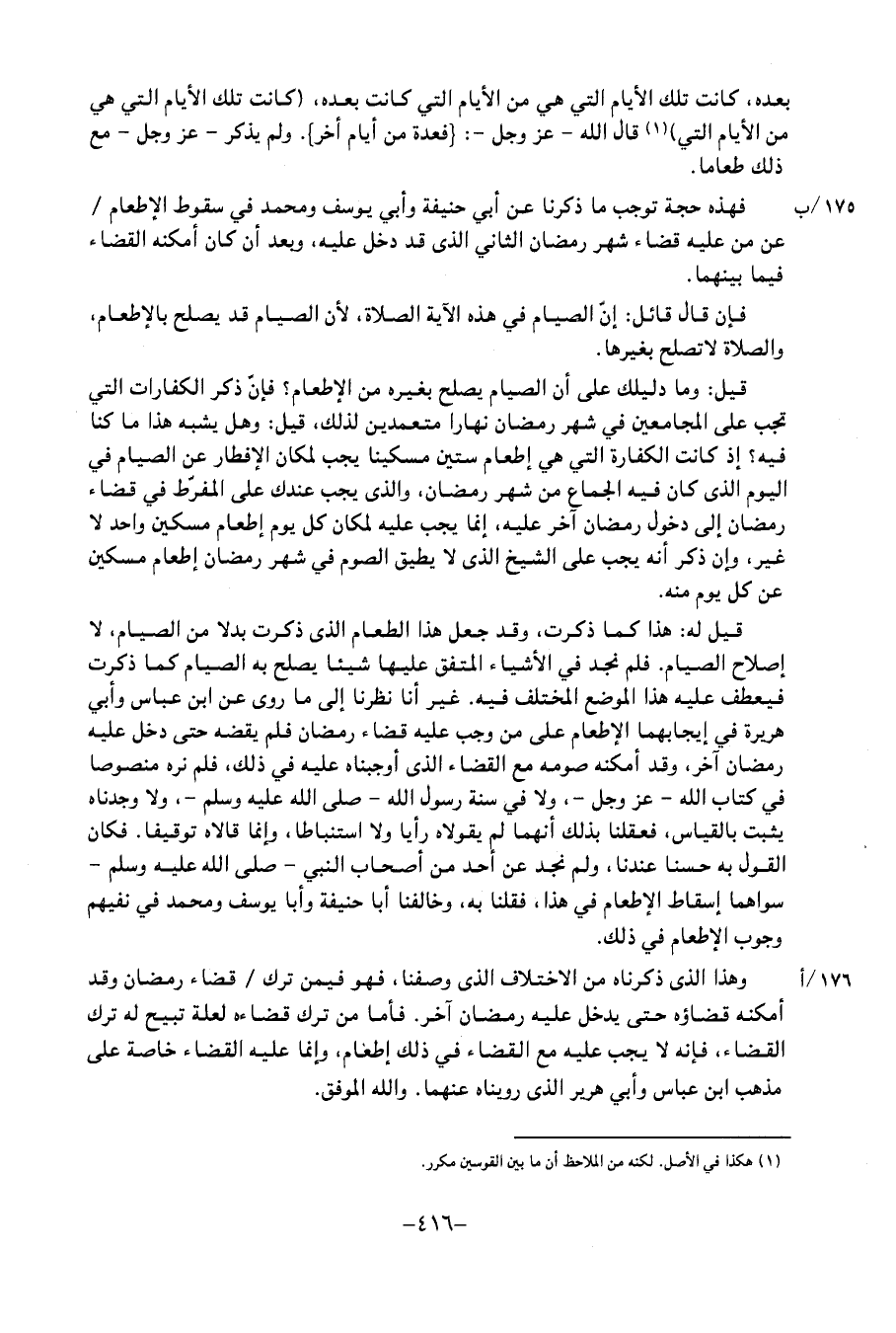 بعده من الْأَيَّام الَّتِي قَالَ الله عَزَّ وَجَلَّ: {فَعِدَّةٌ مِنْ أَيَّامٍ أُخَرَ} ، وَلم يذكر عَزَّ وَجَلَّ مَعَ ذَلِكَ طَعَاما فَهَذِهِ حجَّة توجب مَا ذكرنَا عَنْ أَبِي حَنِيفَةَ، وأَبِي يُوسُفَ، وَمُحَمّد، فِي سُقُوط الْإِطْعَام، عَنْ من عَلَيْهِ قَضَاء شهر رَمَضَان الثَّانِي الَّذِي قَدْ دخل عَلَيْهِ، وَبعد أَن كَانَ أمكنه الْقَضَاء فِيمَا بينهمَا فَإِن قَالَ قَائِل: إِن الصّيام فِي هَذِهِ الْآيَة الصَّلَاة، لِأَن الصّيام قَدْ يصلح بِالْإِطْعَامِ، وَالصَّلَاة لَا تصلح بغَيْرهَا قيل ومَا دليلك عَلَى أَن الصّيام يصلح بِغَيْرِهِ من الْإِطْعَام؟ فَإِن ذكر الْكَفَّارَات الَّتِي تَجِبُ عَلَى الْمُجَامِعَيْنِ فِي شهر رَمَضَان نَهَارا متعمدين لِذَلِكَ، قيل: وَهل يشبه هَذَا مَا كُنَّا فِيه؟ إِذْ كَانَتِ الْكَفَّارَة الَّتِي هِيَ إطْعَام