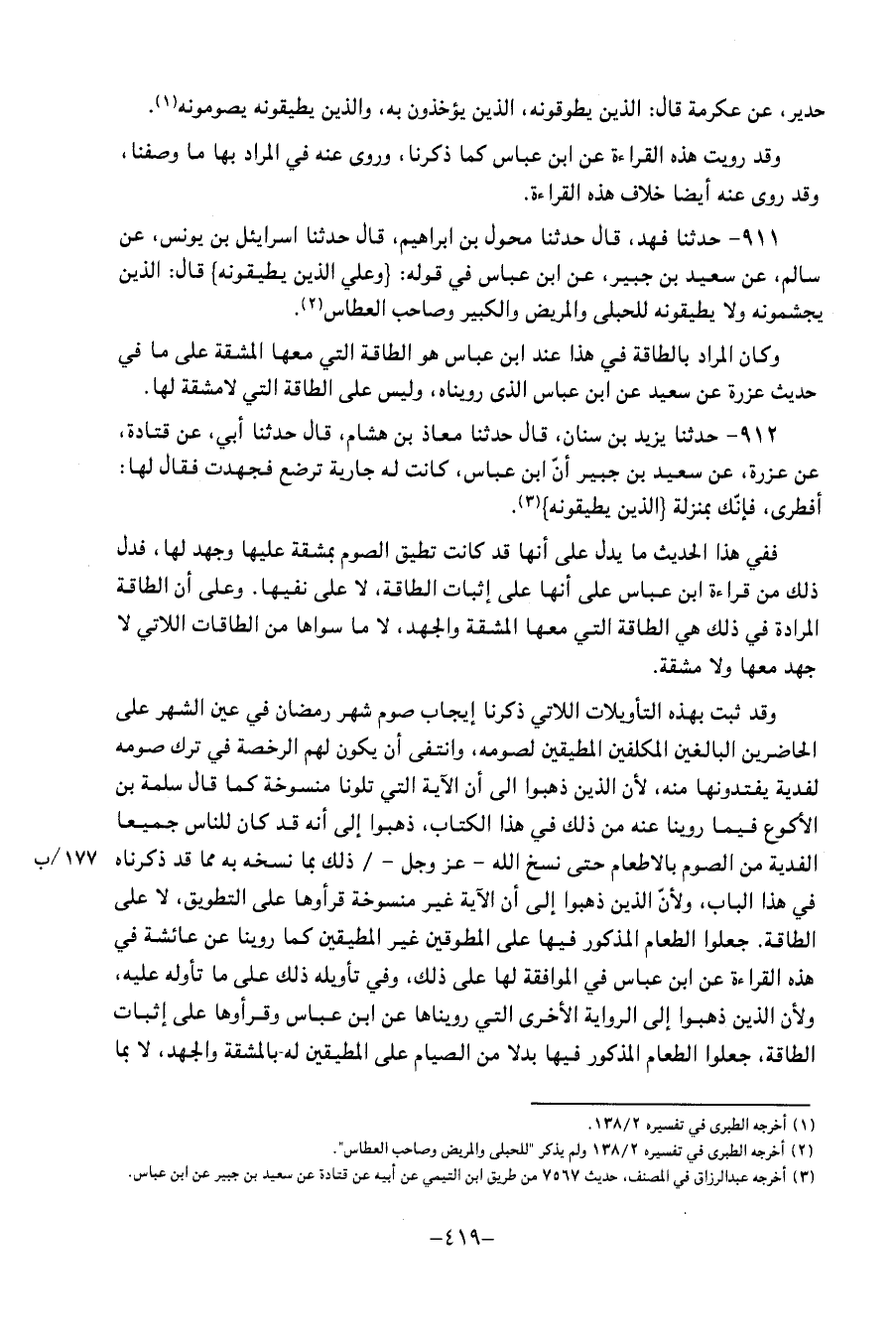 911 - حَدَّثَنَا فَهْدٌ، قَالَ: حَدَّثَنَا مِحْوَلُ بْنُ إِبْرَاهِيمَ، قَالَ: حَدَّثَنَا إِسْرَائِيلُ بْنُ يُونُسَ، عَنْ سَالِمٍ، عَنْ سَعِيدِ بْنِ جُبَيْرٍ، عَنِ ابْنِ عَبَّاسٍ، فِي قَوْلِهِ: {وَعَلَى الَّذِينَ يُطِيقُونَهُ} قَالَ: " الَّذِينَ يُجَشَّمُونَهُ وَلا يُطِيقُونَهُ لِلْحُبْلَى وَالْمَرِيضِ وَالْكَبِيرِ وَصَاحِبِ الْعُطَاسِ " وكَانَ المُرَاد بالطاقة فِي هَذَا عِنْد ابْن عَبَّاس هُوَ الطَّاقَة الَّتِي مَعهَا الْمَشَقَّة عَلَى مَا فِي حَدِيث عزْرَة، عَنْ سعيد، عَنِ ابْنِ عَبَّاس، الَّذِي روينَاهُ، ولَيْسَ عَلَى الطَّاقَة الَّتِي لَا مشقة لَهَا